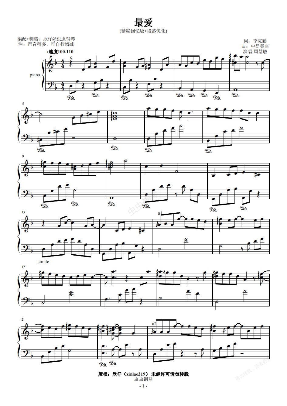 钢琴谱:周慧敏-d《最爱》(精编回忆版+段落优化)