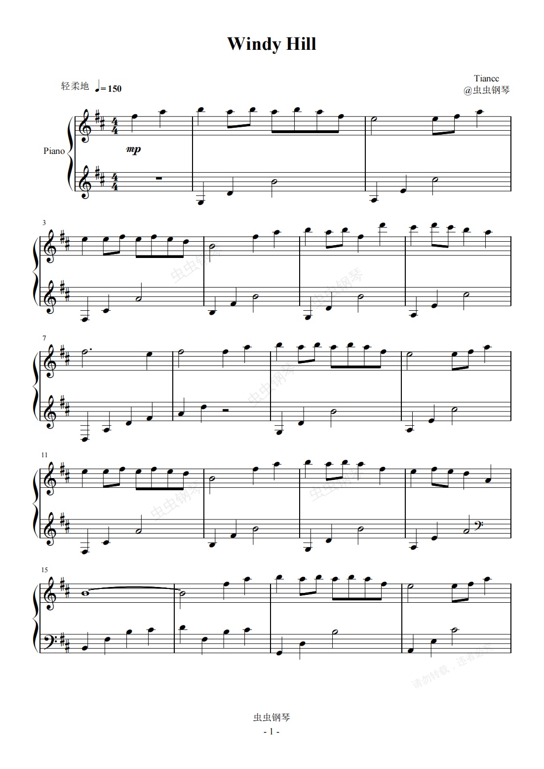 钢琴谱:《Windy Hill》 羽肿,教学专用版,超清晰~599难度