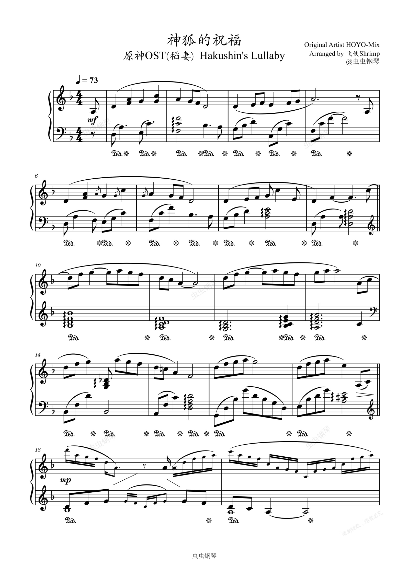 钢琴谱:【原神OST】神狐的祝福|Hakushin's Lullaby(稻妻)