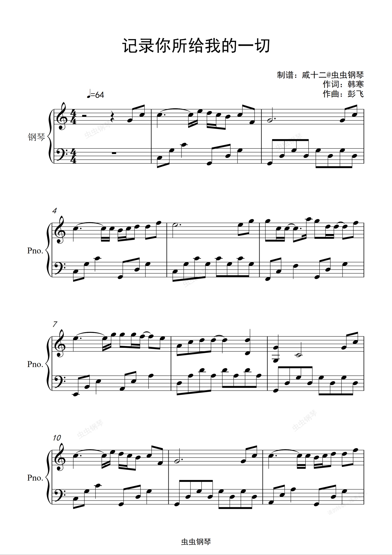 钢琴谱:记录你所给我的一切 (《断·桥》电影推广曲) -C调简单版