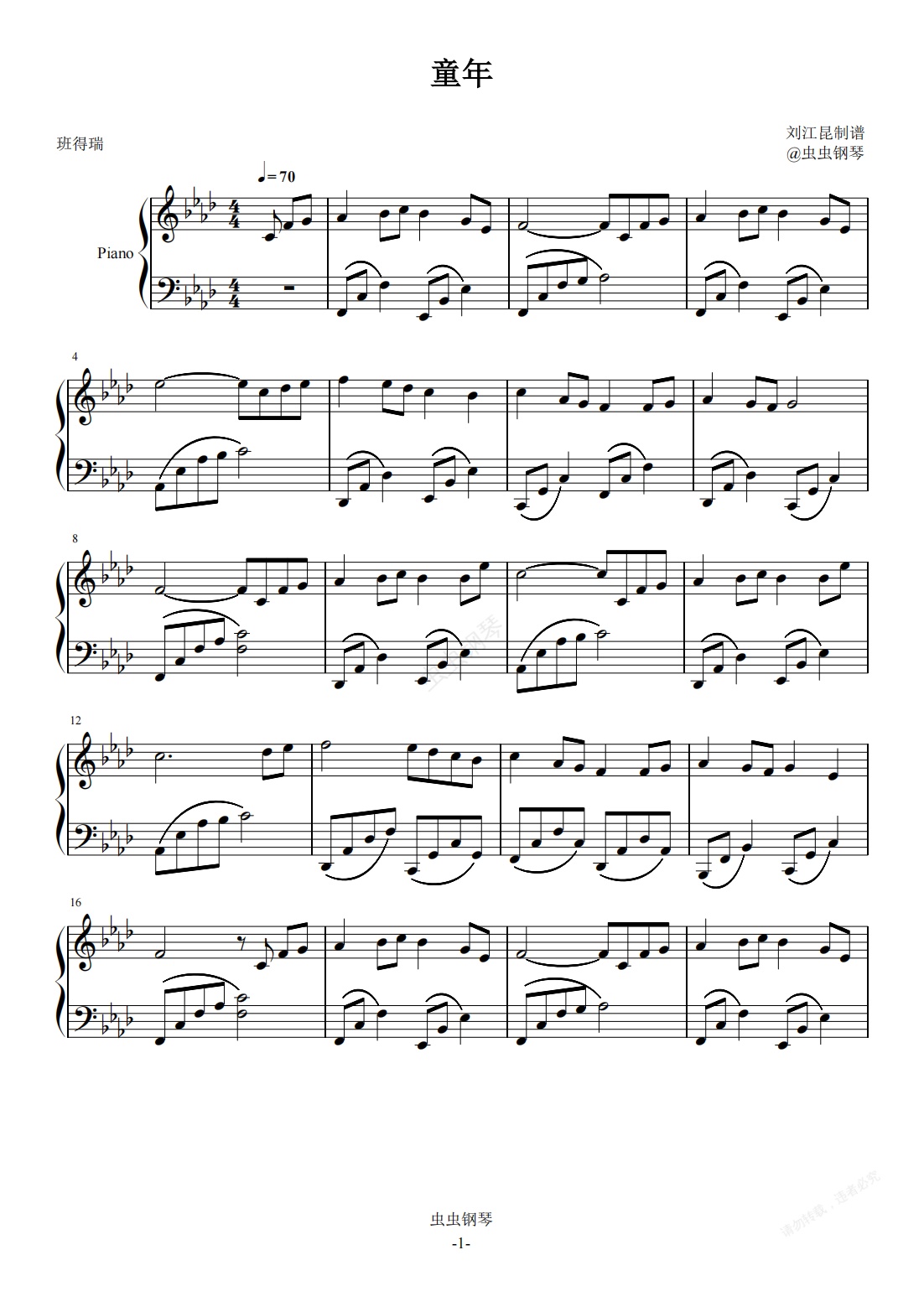 钢琴谱:童年(原调精编)