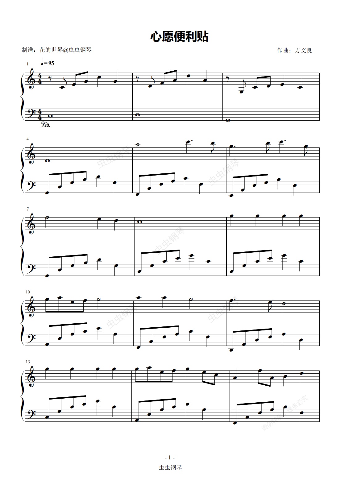 钢琴谱:心愿便利贴 C调简易版 命中注定我爱你 片尾曲