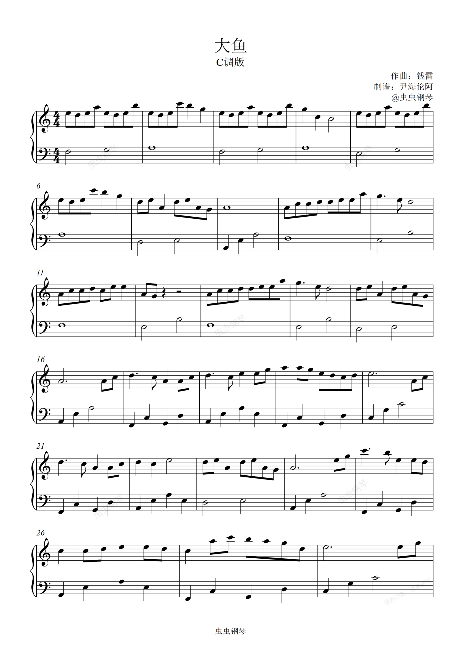 钢琴谱:《大鱼海棠》印象曲--大鱼 c调版简单谱