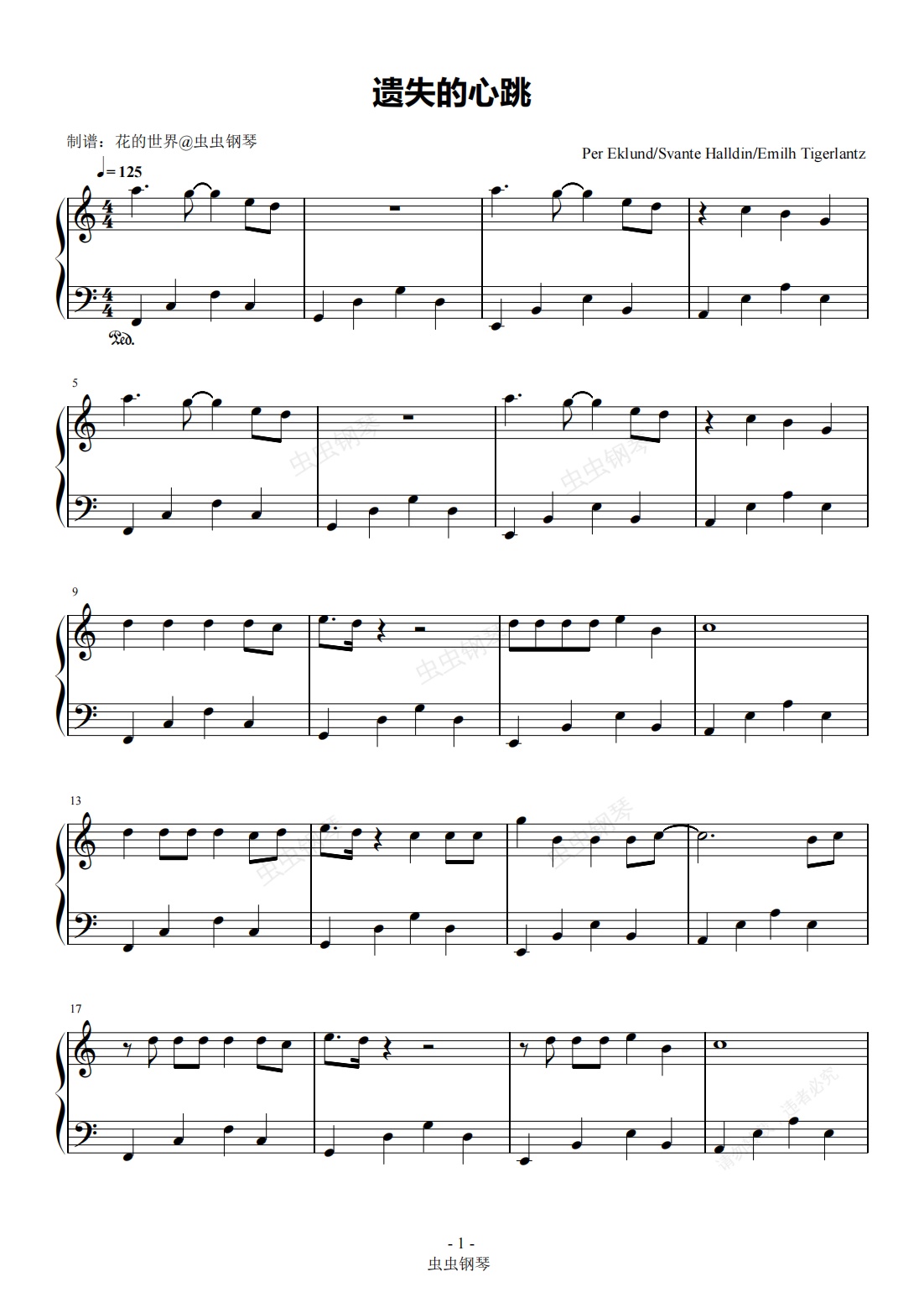 钢琴谱:遗失的心跳 C调简易版 萧亚轩
