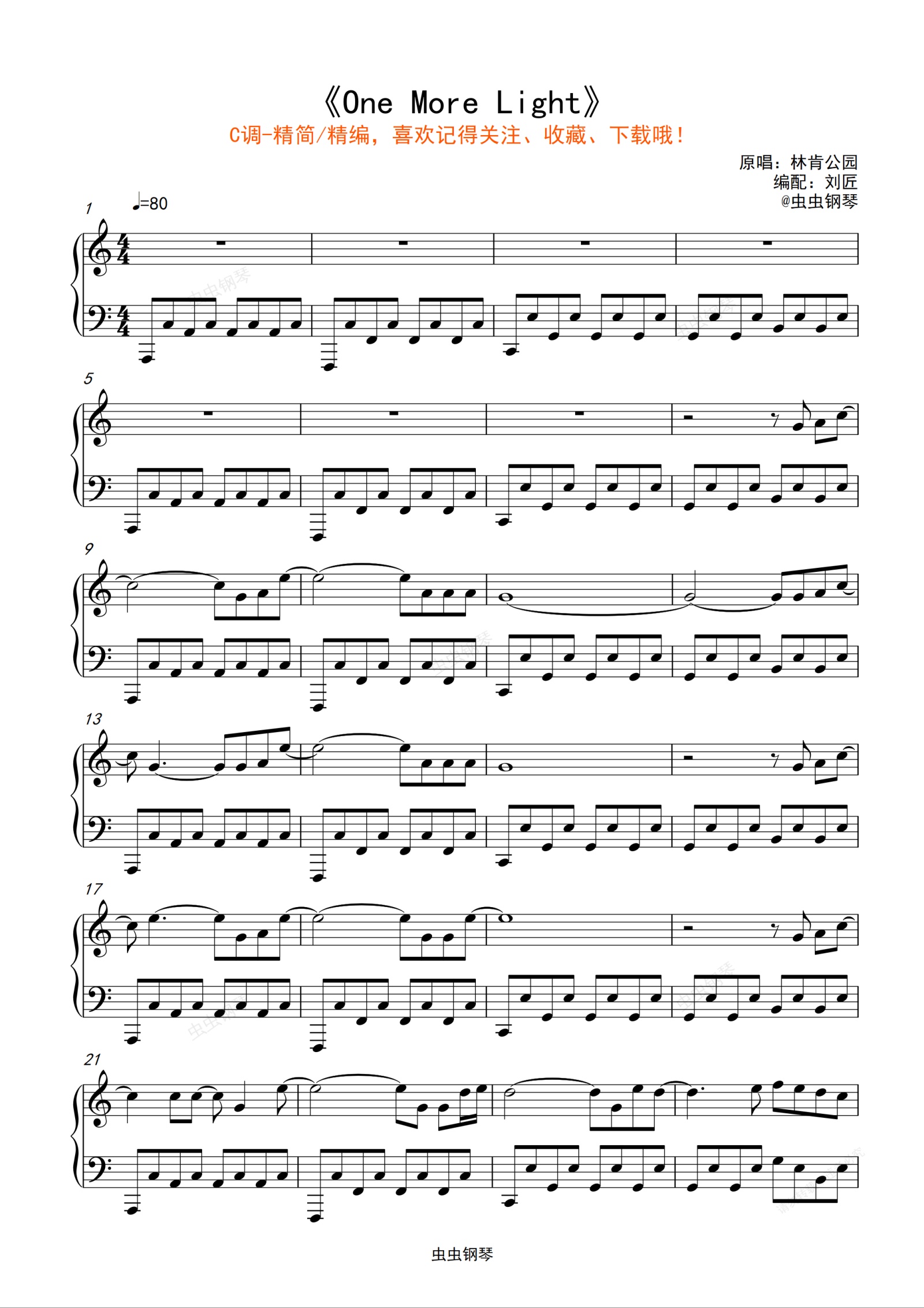 钢琴谱:【经典推荐】《One More Light》刘匠精编,C调,好听好弹