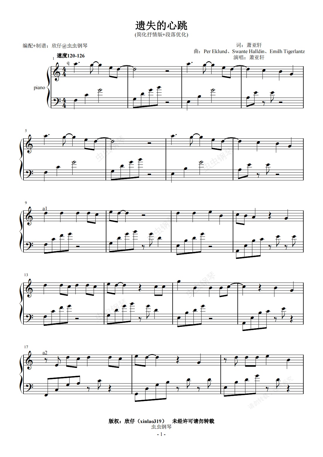 钢琴谱:萧亚轩-a《遗失的心跳》(简化抒情版+段落优化)