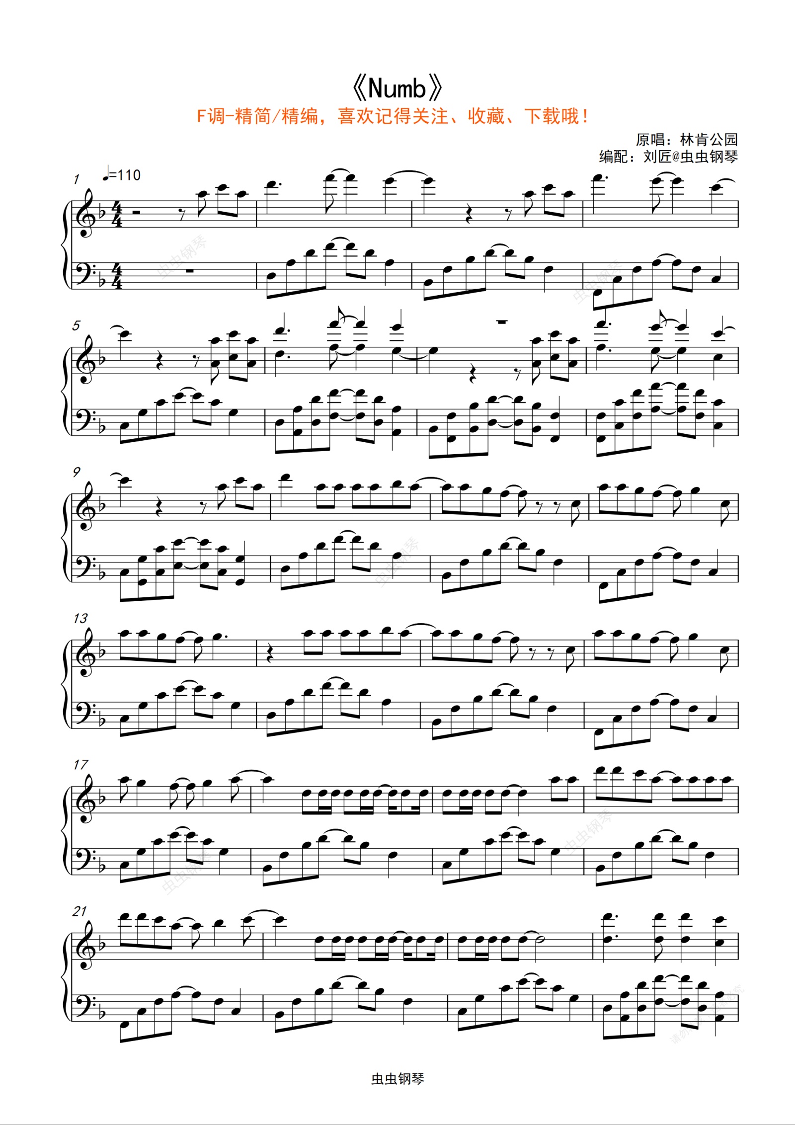 钢琴谱:【好听好弹】《Numb》- 刘匠编配-F调