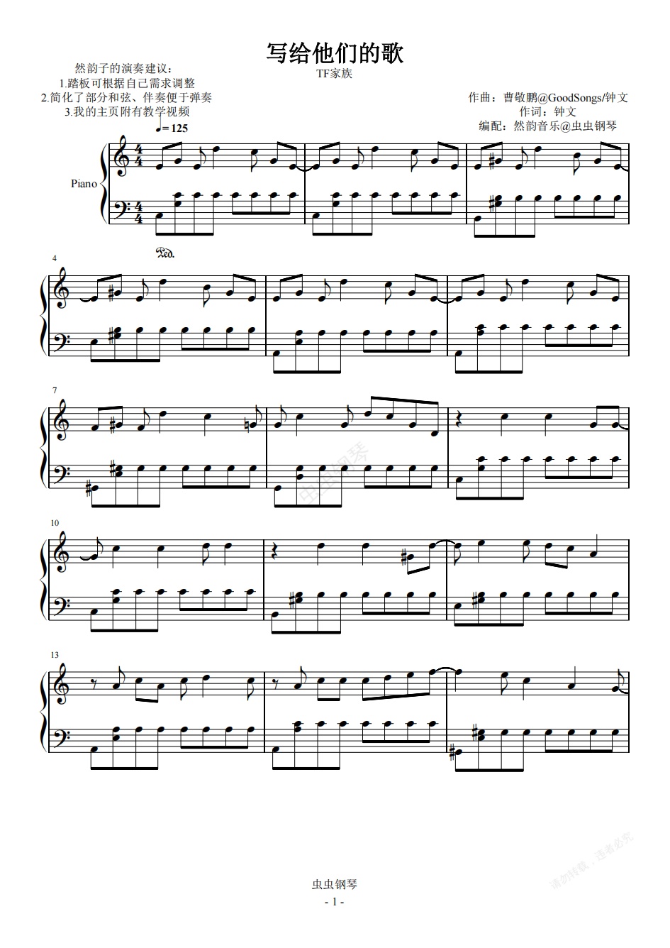 钢琴谱:【C调】写给他们的歌-TF家族 钢琴完美独奏
