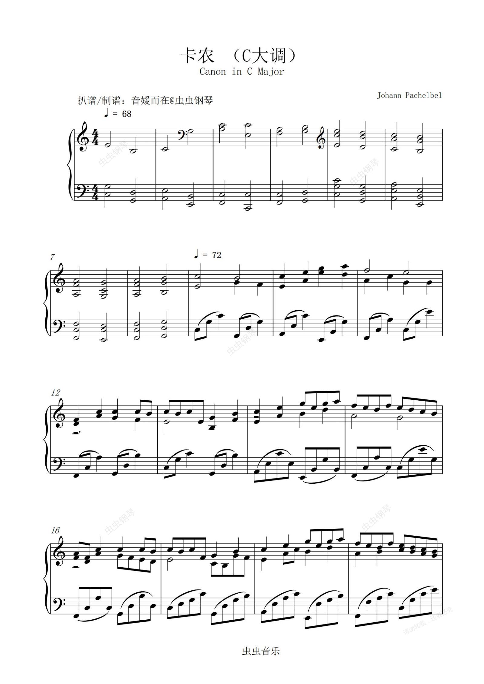 钢琴谱:卡农(C调经典钢琴版)