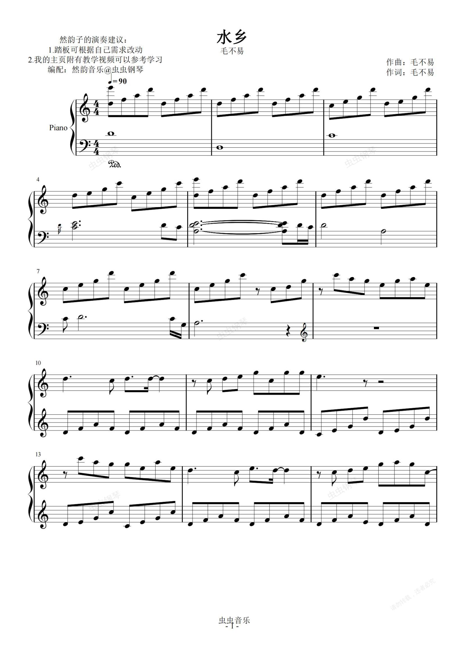 钢琴谱:【C调】水乡-毛不易 钢琴极限还原