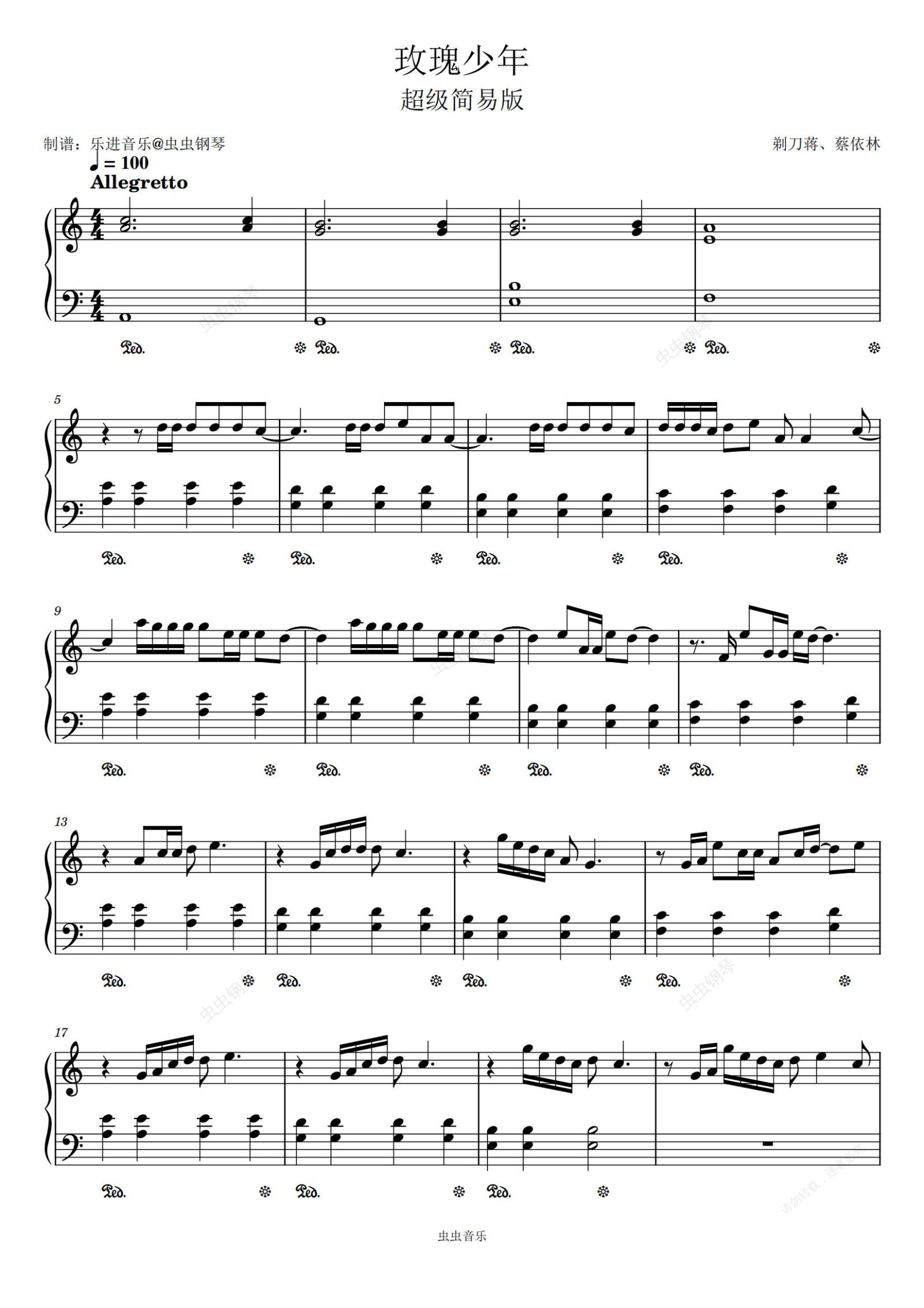 钢琴谱:《玫瑰少年》C调超简版 拜厄基础
