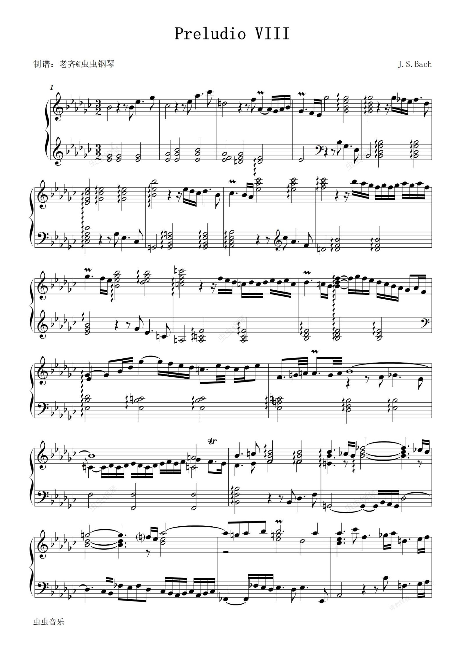 钢琴谱:【巴赫十二平均律】第一册 降E小调第八首BWV 852