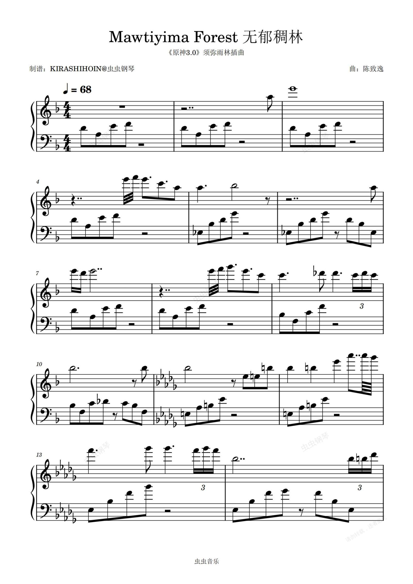 钢琴谱:Mawtiyima Forest 无郁稠林(《原神3.0》须弥雨林插曲)- 陈致逸