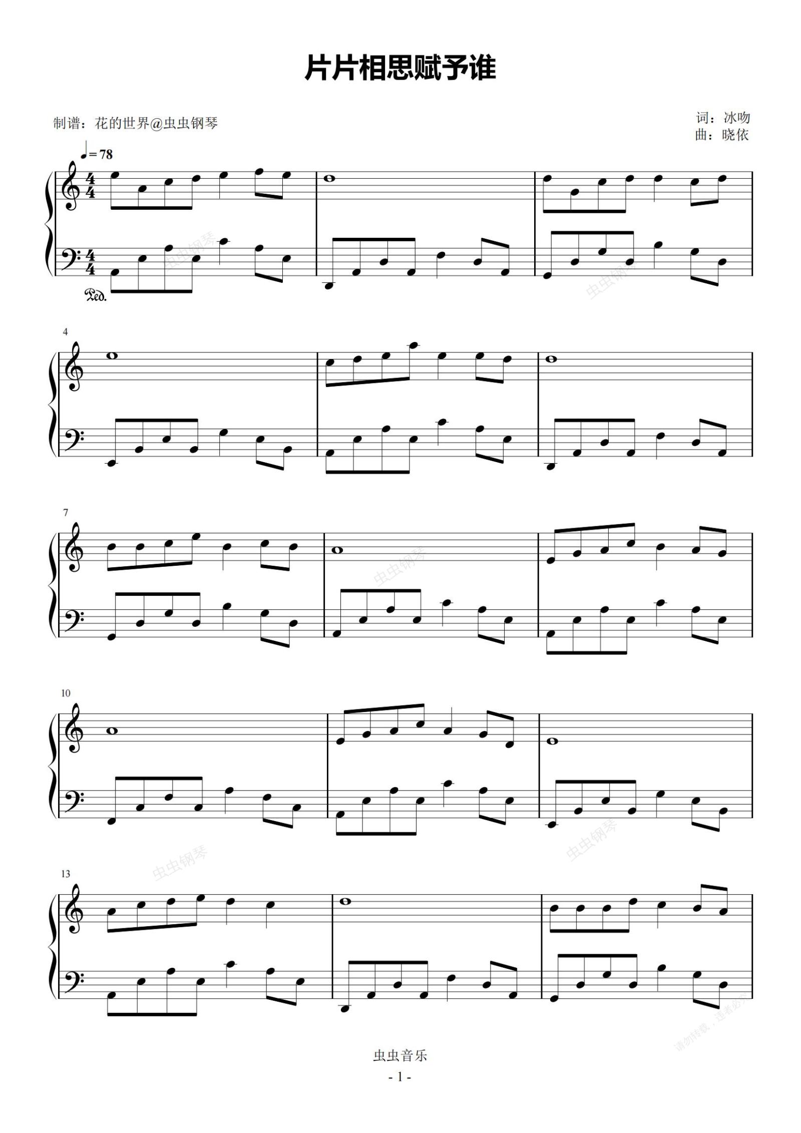 钢琴谱:片片相思赋予谁 C调简易版 晓依