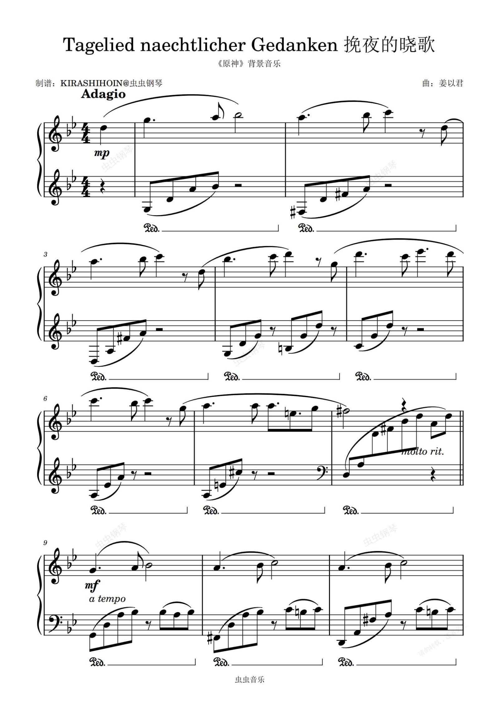 钢琴谱:Tagelied naechtlicher Gedanken 挽夜的晓歌(《原神》背景音乐)- 姜以君