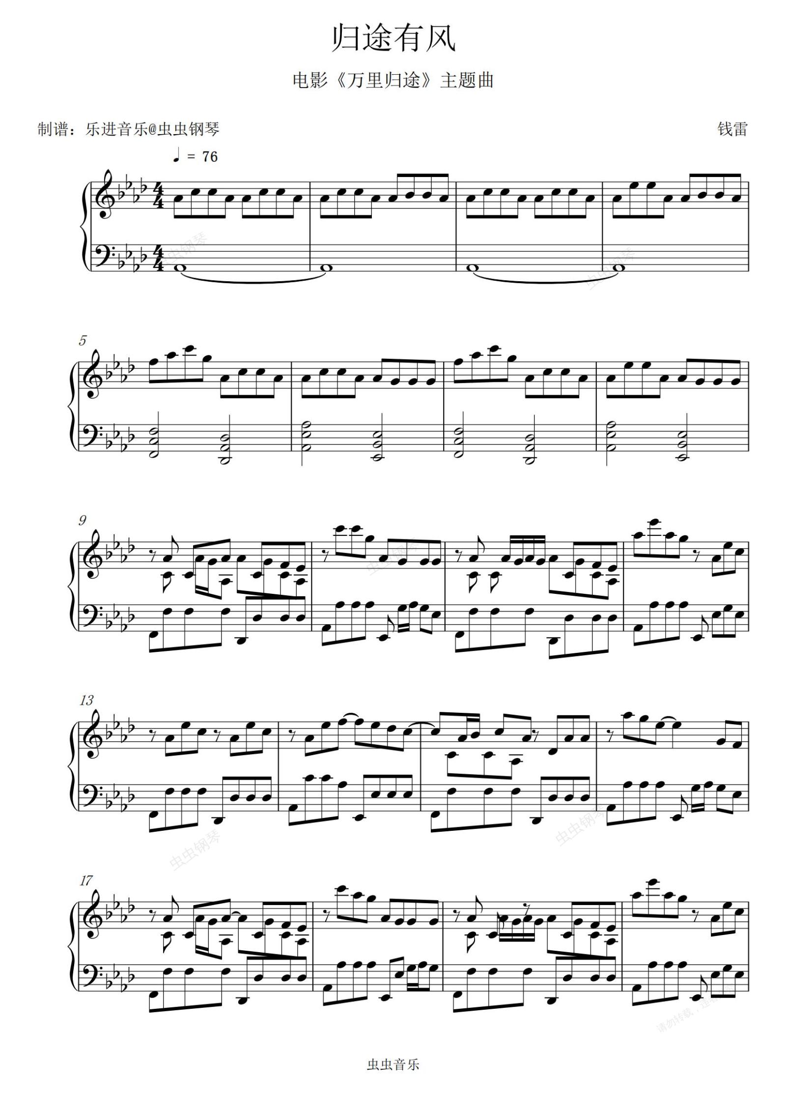 钢琴谱:《归途有风》原调精编版 电影《万里归途》主题曲
