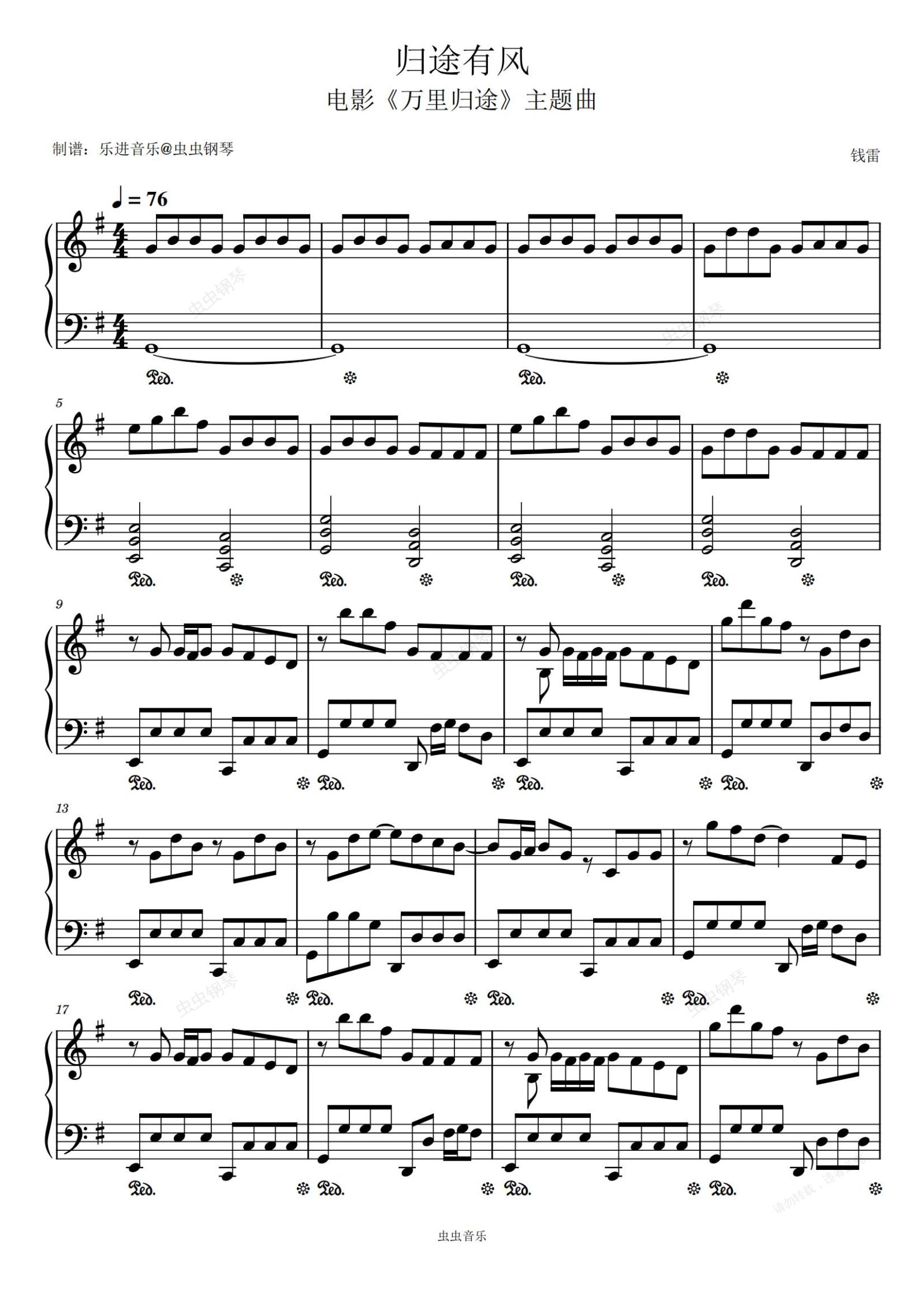 钢琴谱:《归途有风》 G调简单版