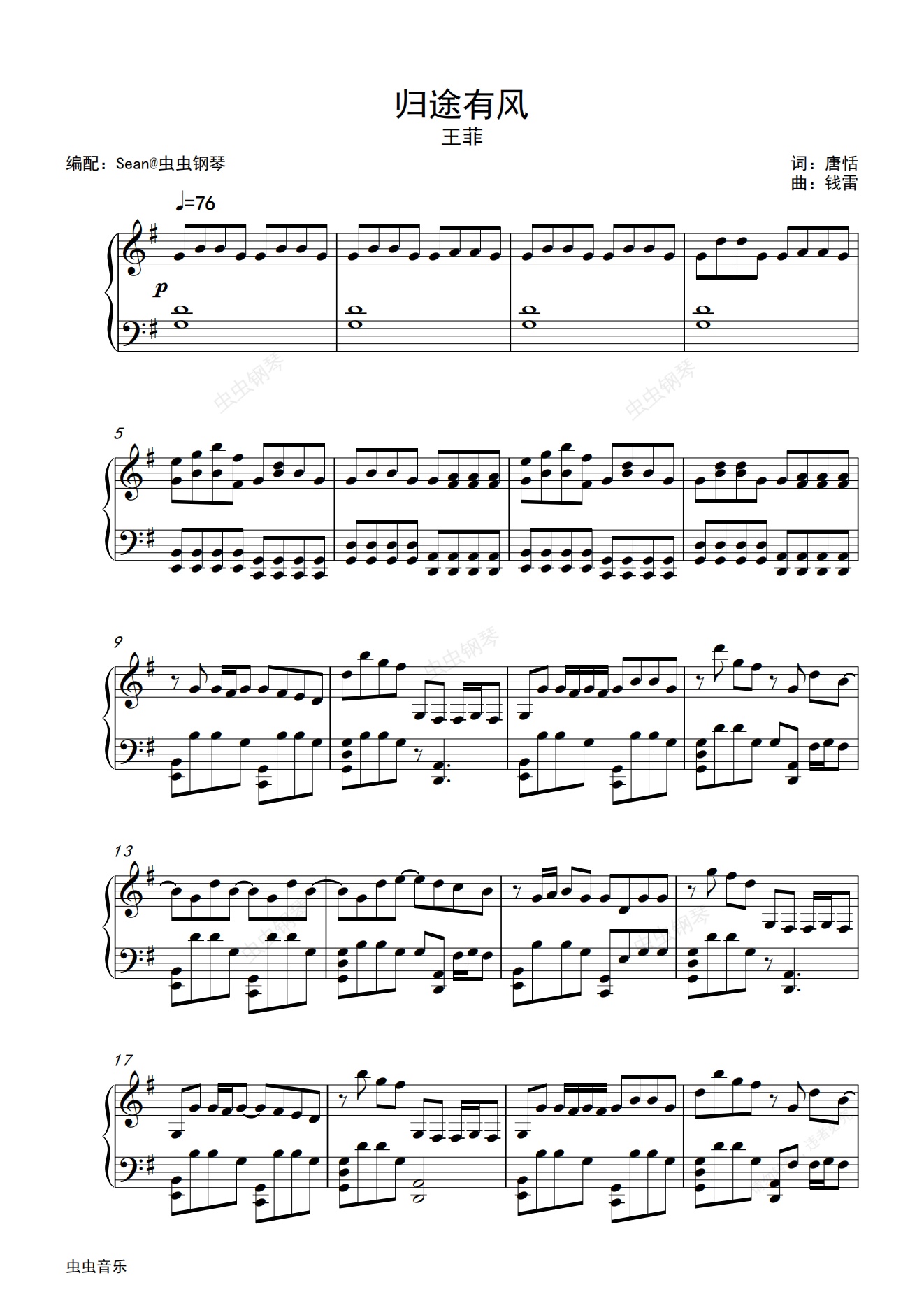 钢琴谱:王菲《归途有风》G调版-Sean编配