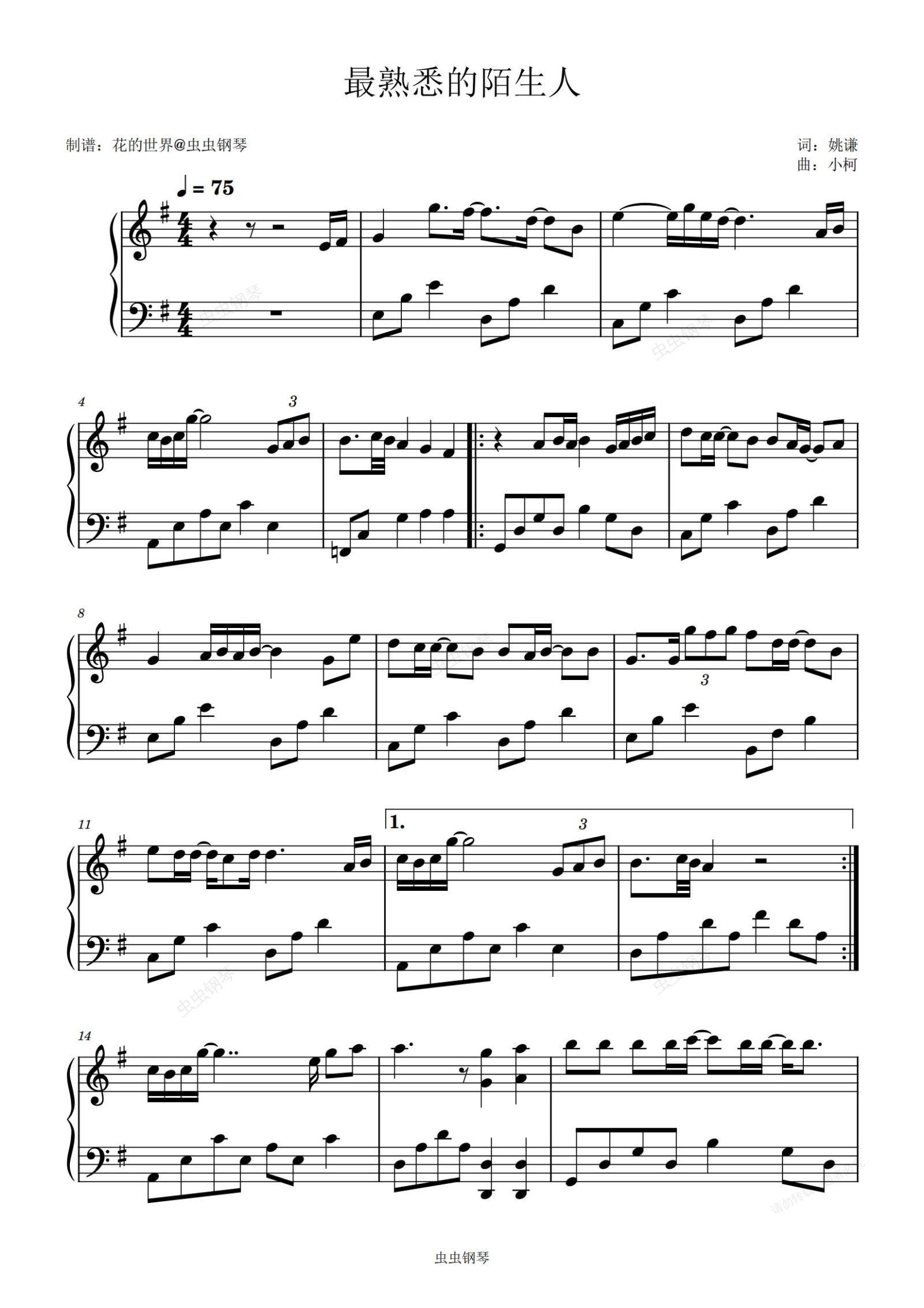 钢琴谱:最熟悉的陌生人 原调简易版 萧亚轩