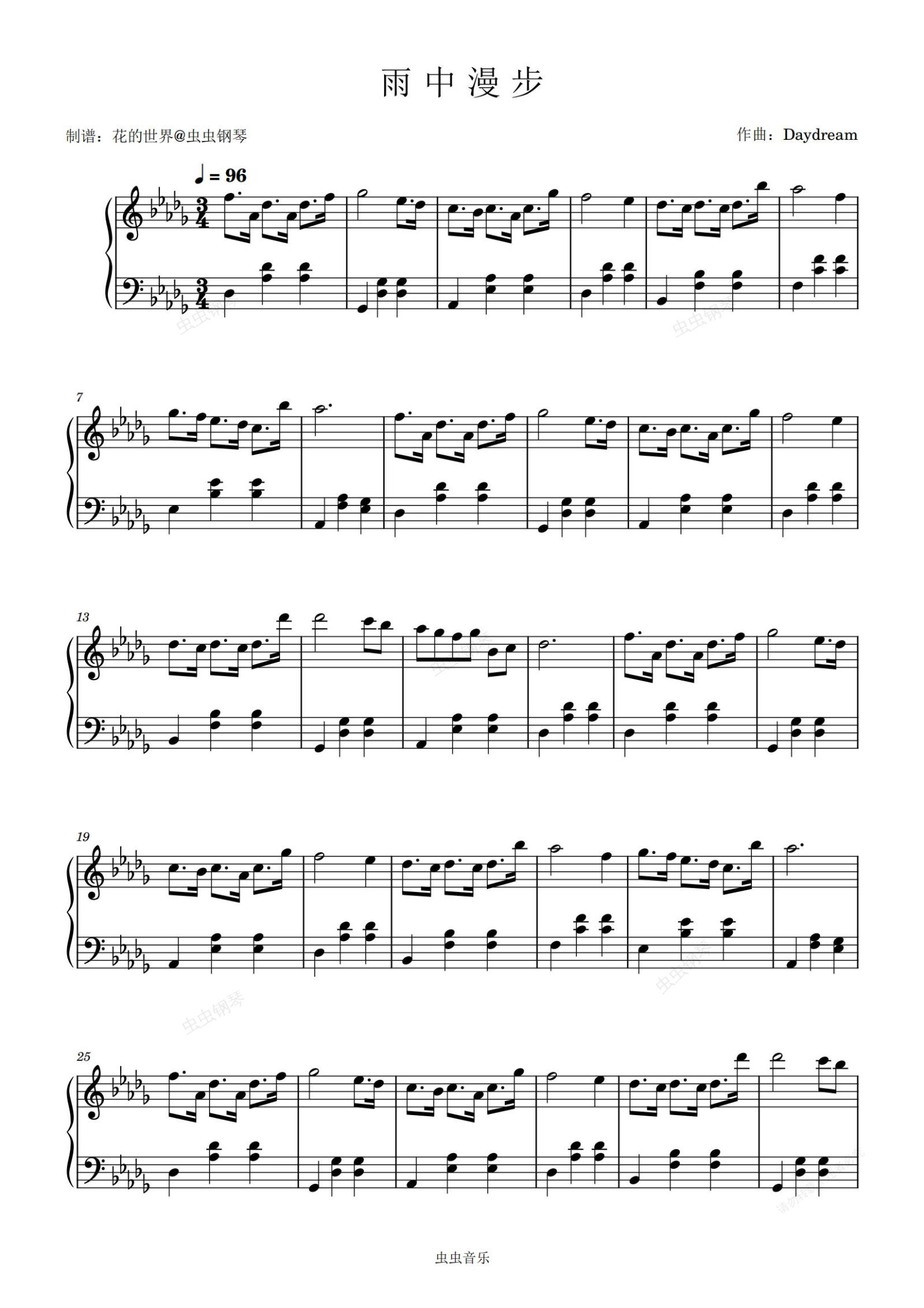 钢琴谱:雨中漫步 Stepping On The Rainy Street 原调简易版 The Daydream