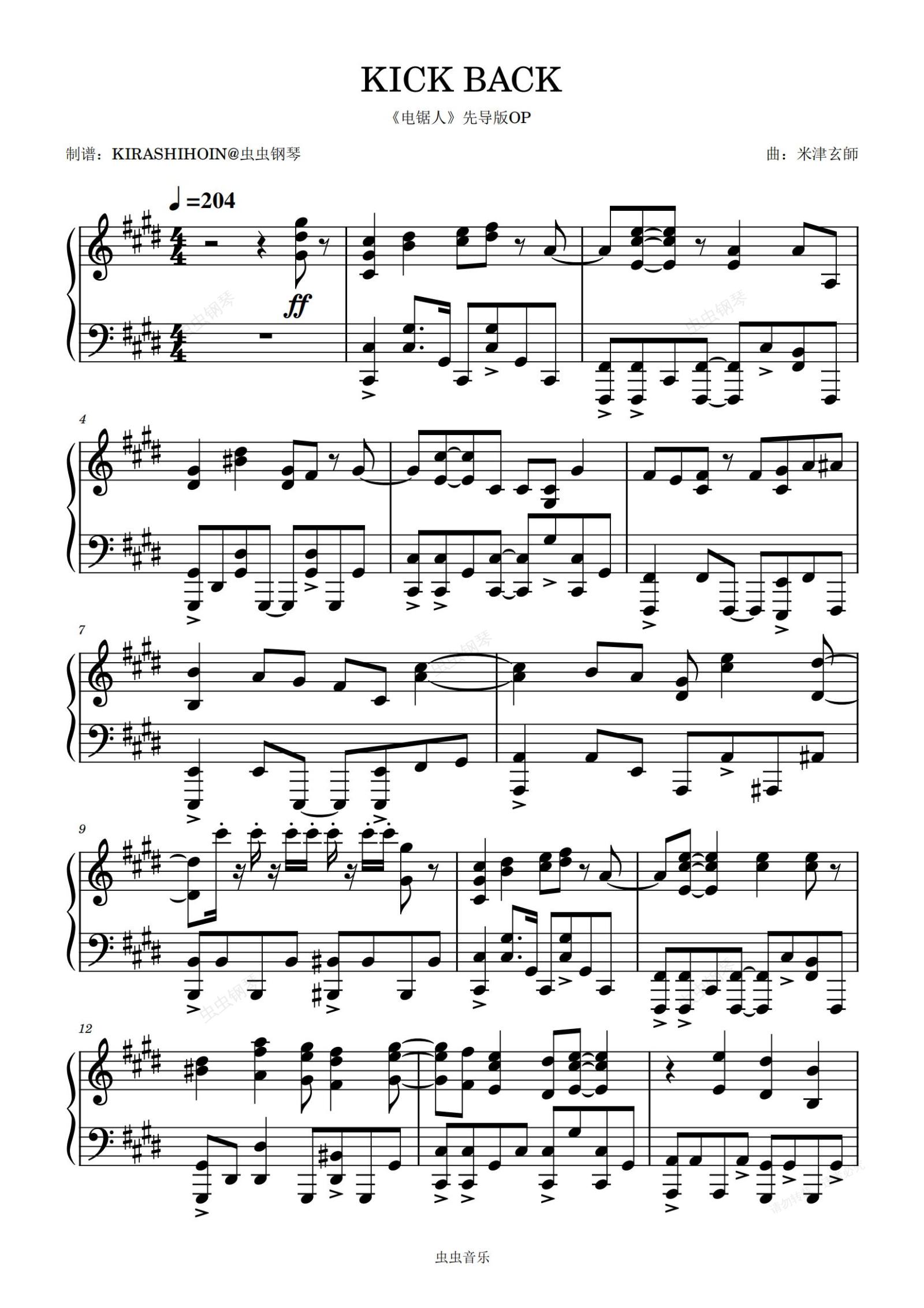 钢琴谱:KICK BACK(《电锯人》先导版OP)- 米津玄师