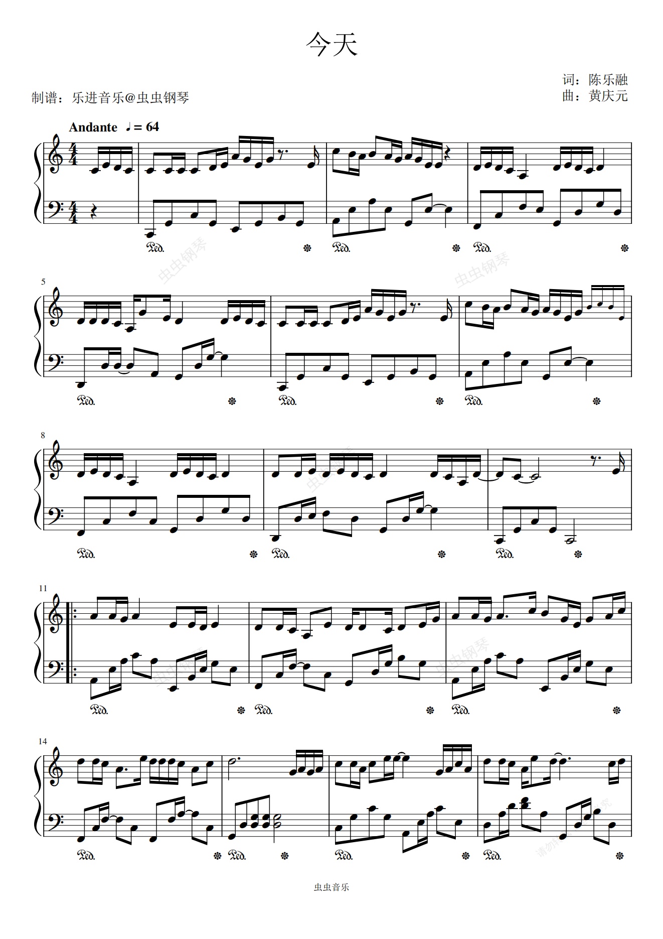 钢琴谱:《今天》C调 刘德华演唱