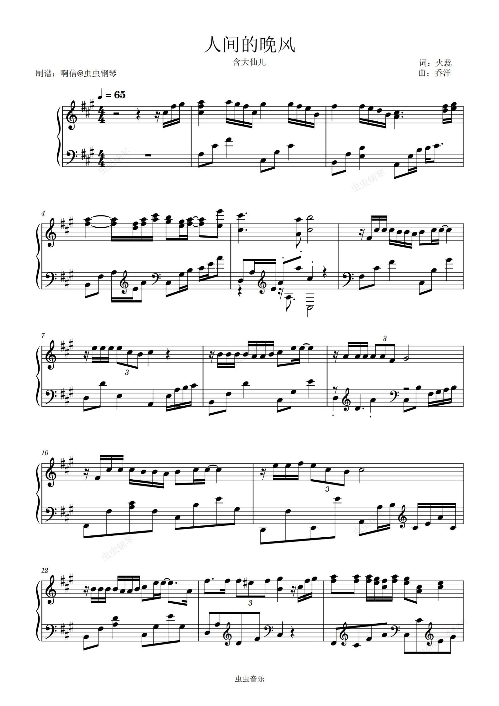 钢琴谱:人间的晚风-含大仙儿-原版啊信编配