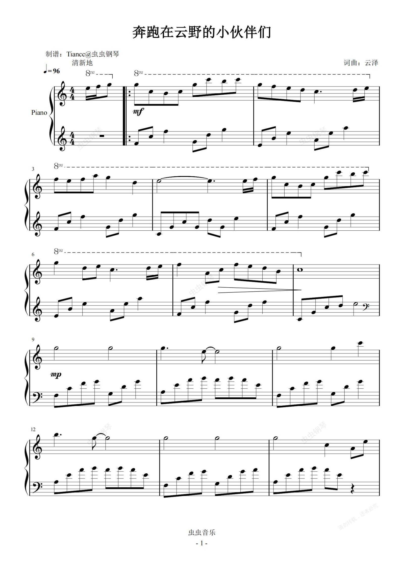 钢琴谱:《奔跑在云野的小伙伴们》C调,清新欢快的小曲,超好听