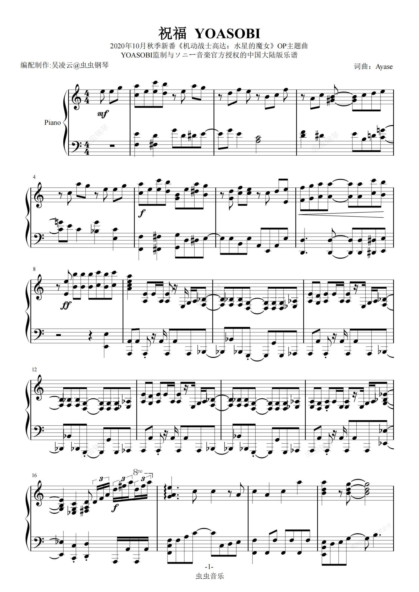 钢琴谱:祝福 YOASOBI 2022年10月秋季新番《机动战士高达:水星的魔女》OP主题曲