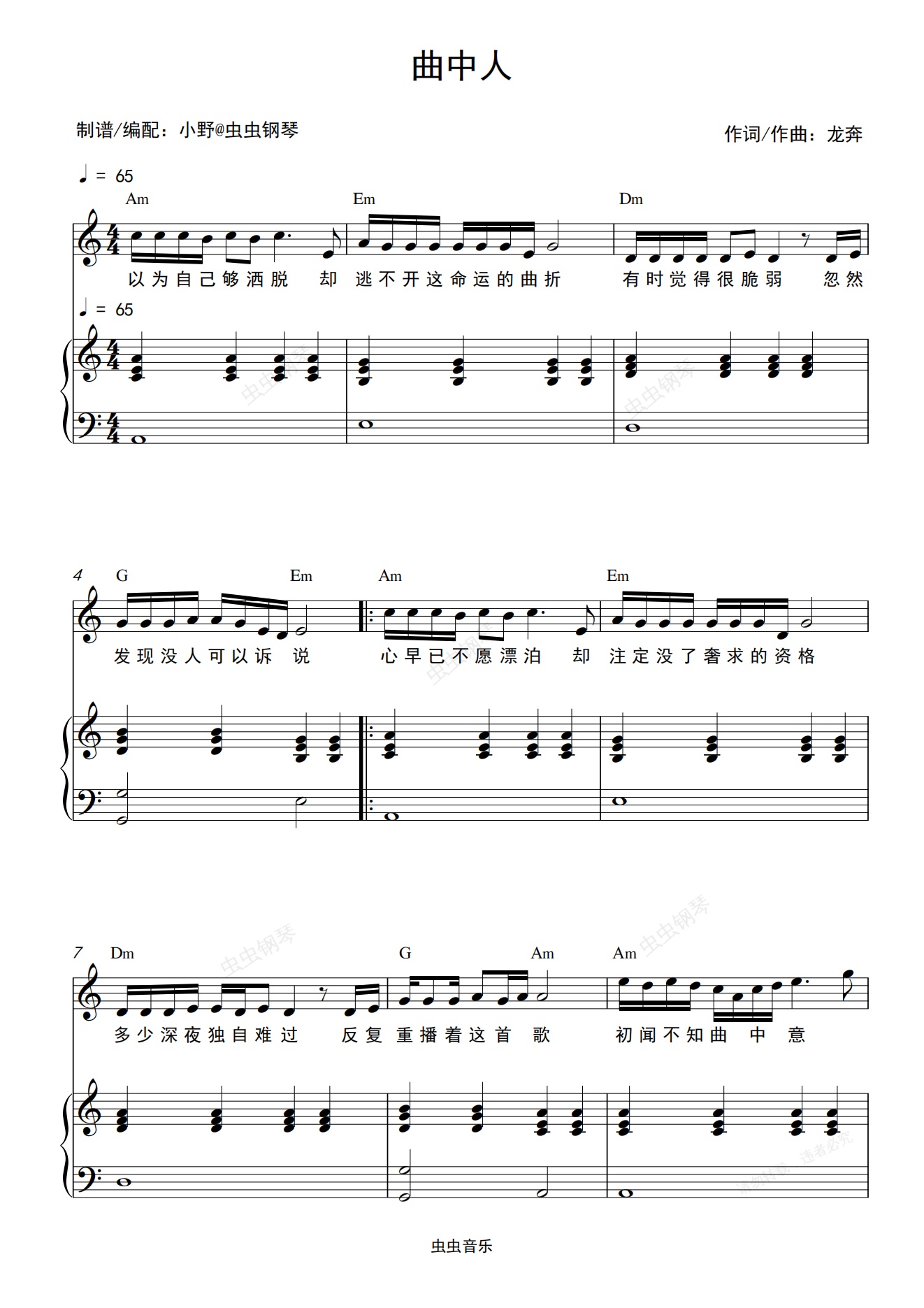 钢琴谱:曲中人(和弦弹唱版)