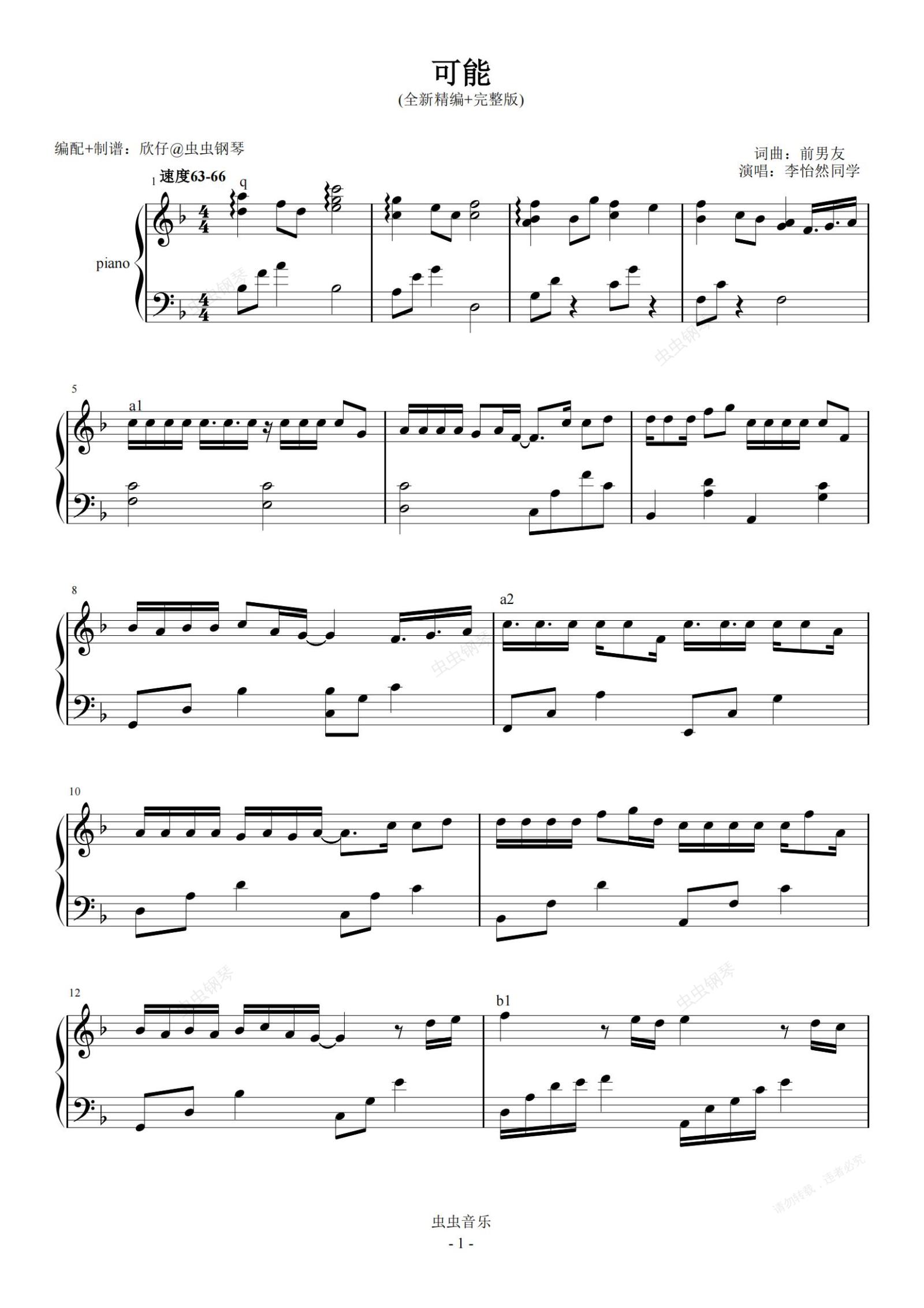 钢琴谱:李怡然同学-F《可能》(全新精编+完整版)