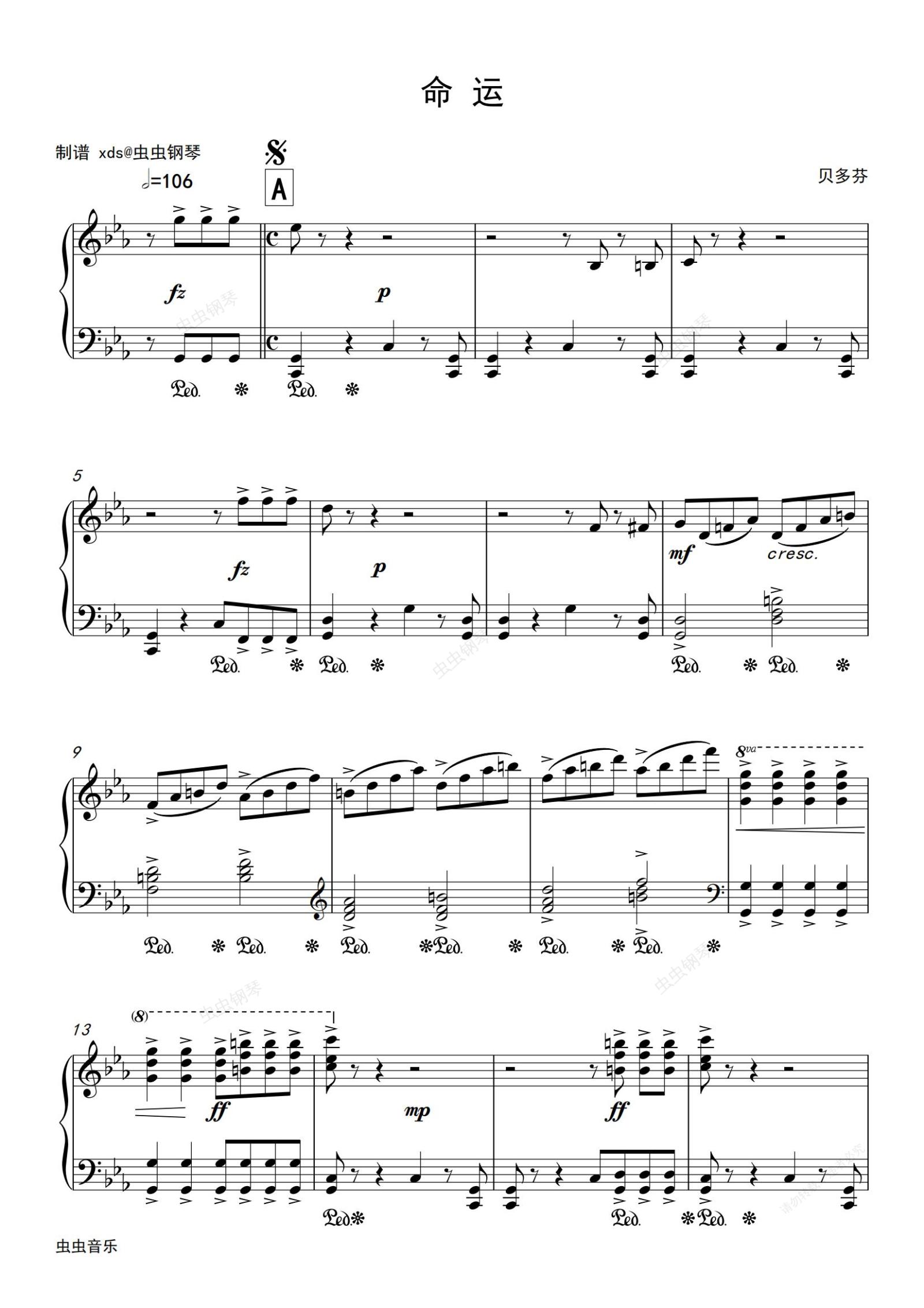 乐曲开始的主题被贝多芬称作“命运的敲门声”,它是乐章的第一主题,阴暗、冷酷、威严,以很强的力度演奏,接着连串不协和分解和弦急促上行,似乎是厄运在四处蔓延,随着力度的渐强琵琶奏出了轰鸣般的和弦……