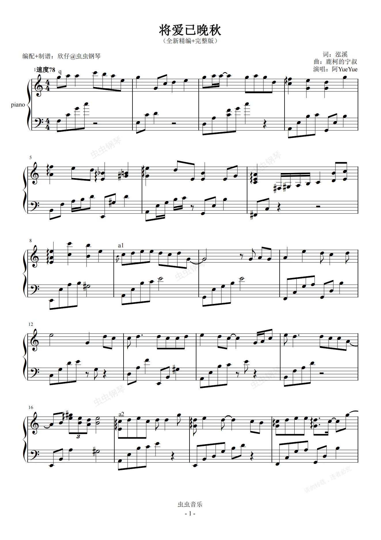 钢琴谱:阿YueYue-a《将爱已晚秋》(全新精编+完整版)