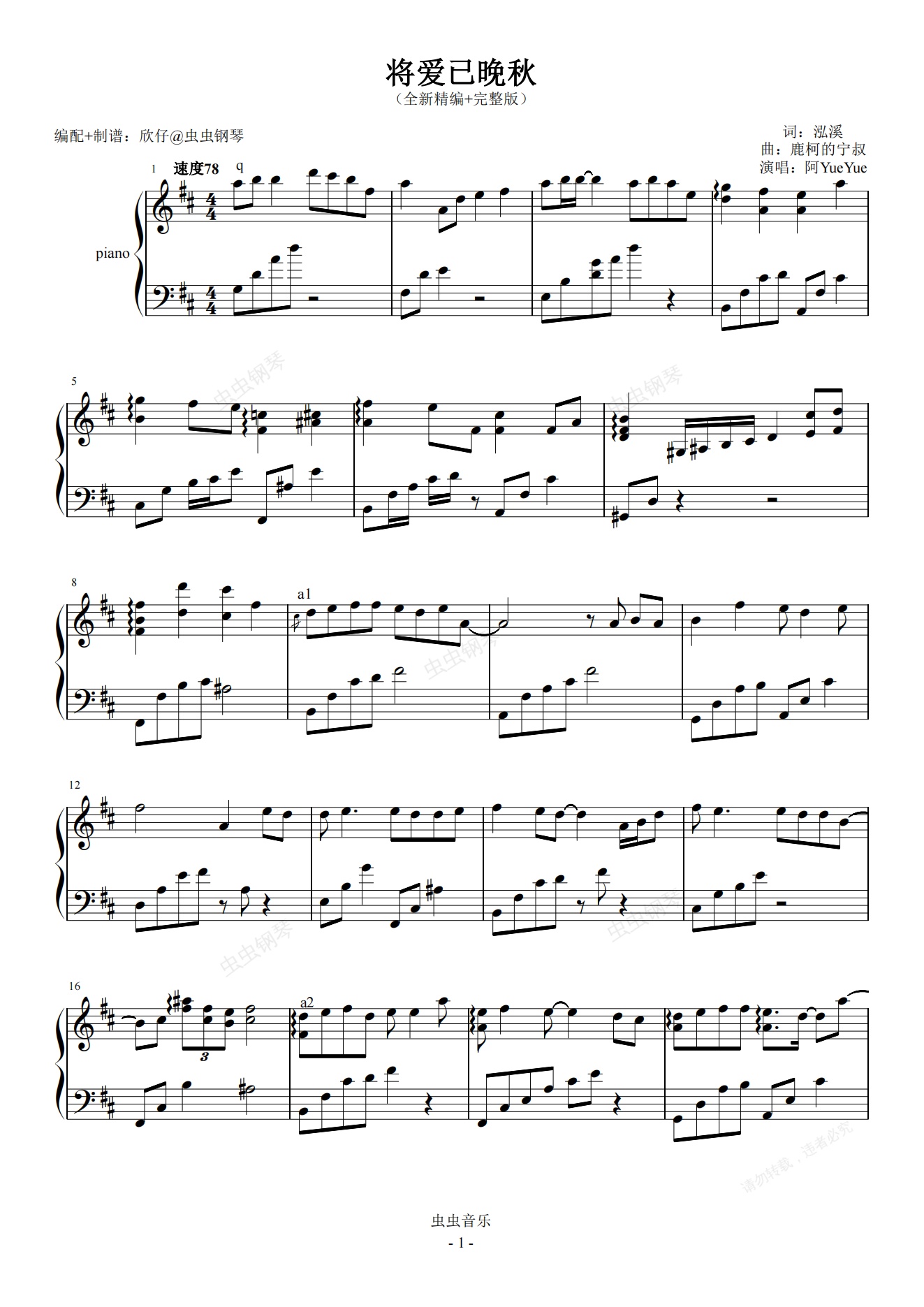 钢琴谱:阿YueYue-b《将爱已晚秋》(全新精编+完整版)