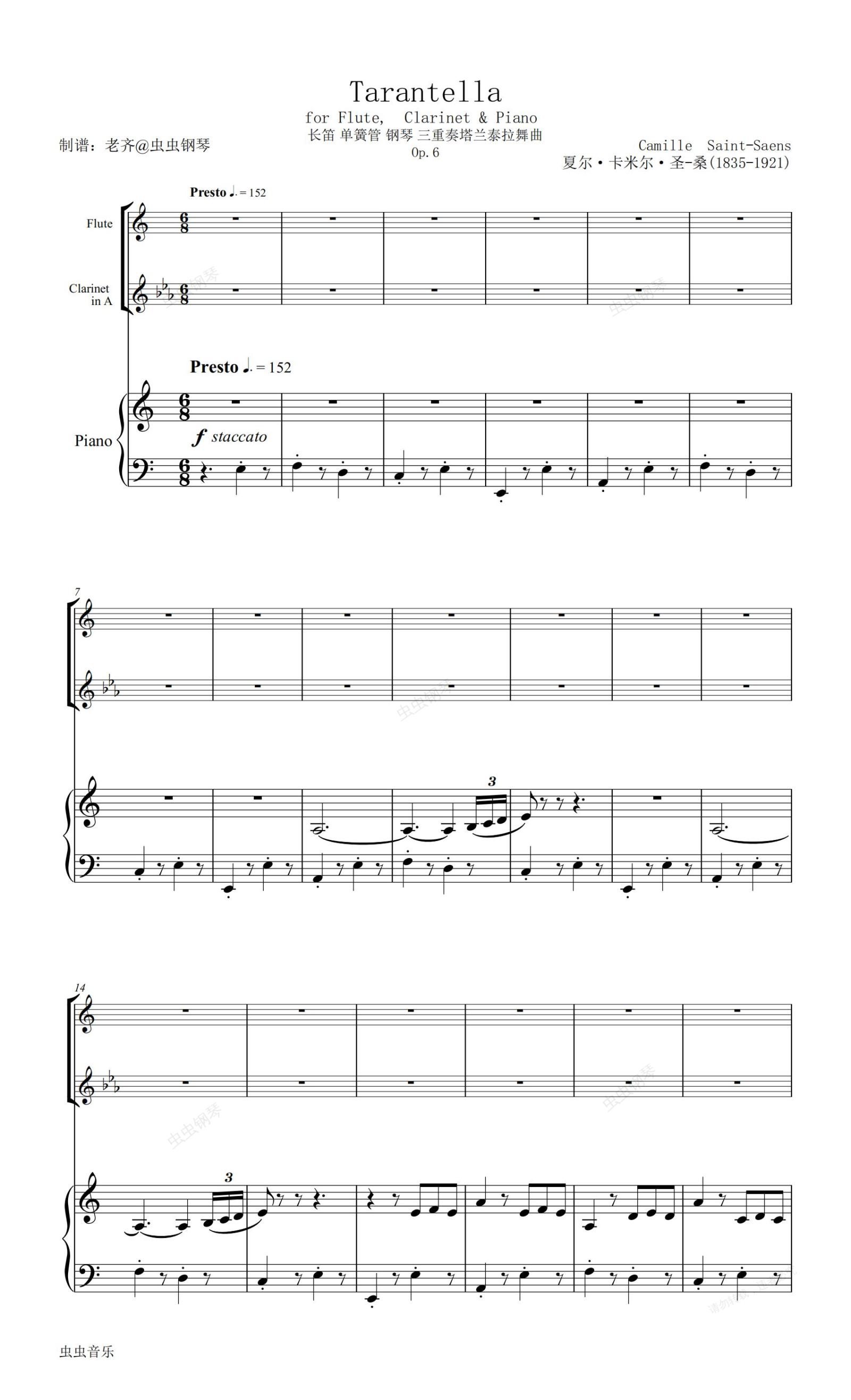 钢琴谱:【圣桑】塔兰泰拉舞曲op.6长笛 单簧管 钢琴 三重奏Tarantella for Flute, Clarinet & Piano