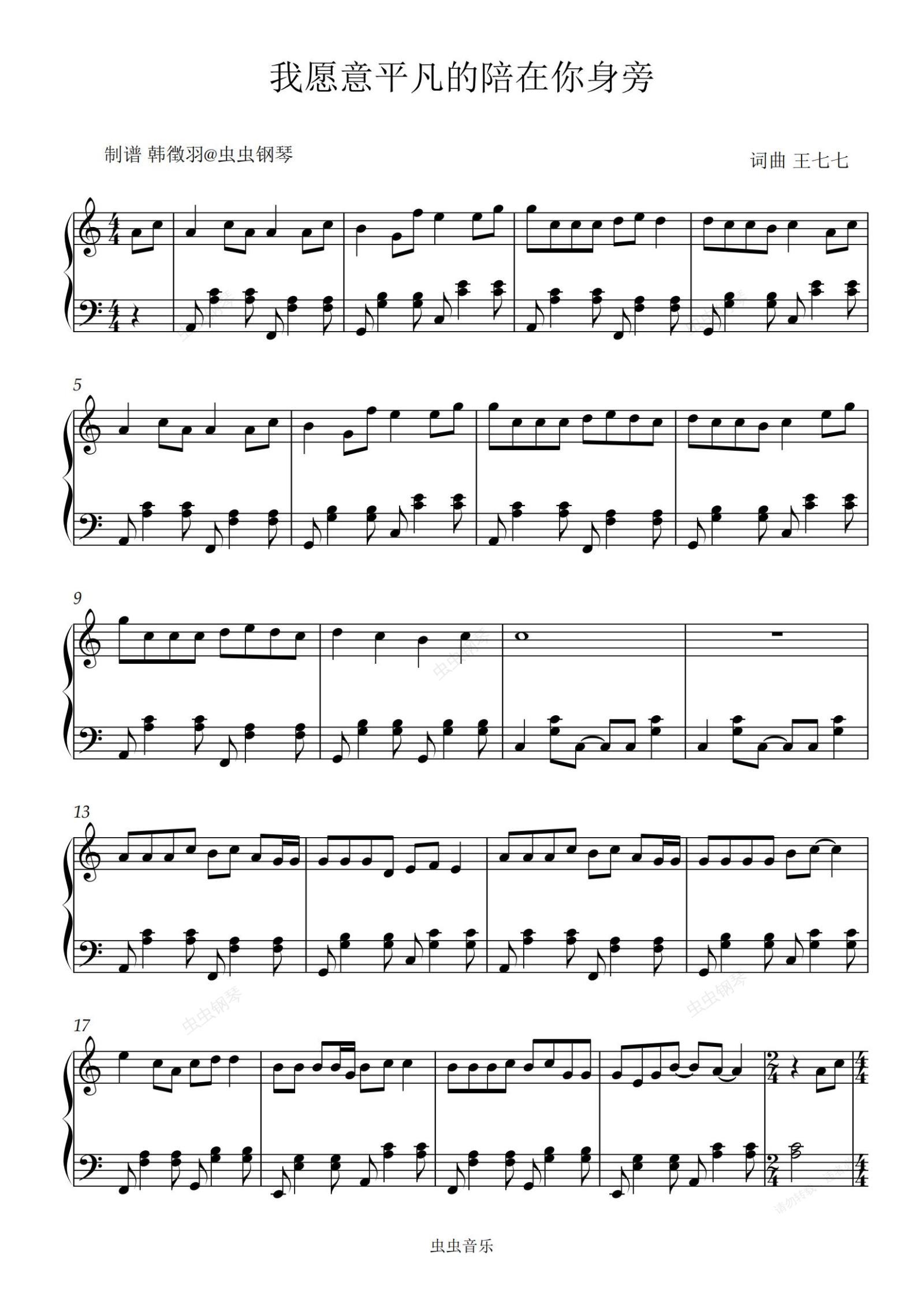 钢琴谱:我愿意平凡的陪在你身旁 王七七 C调简单易弹