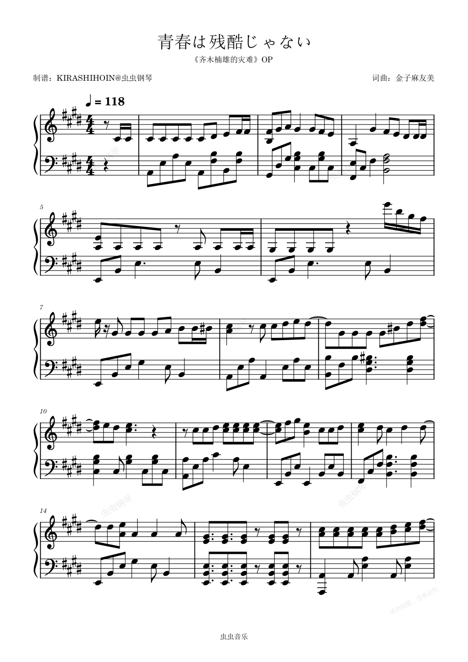钢琴谱:青春は残酷じゃない(《齐木楠雄的灾难》OP/片头曲)- 花江夏树