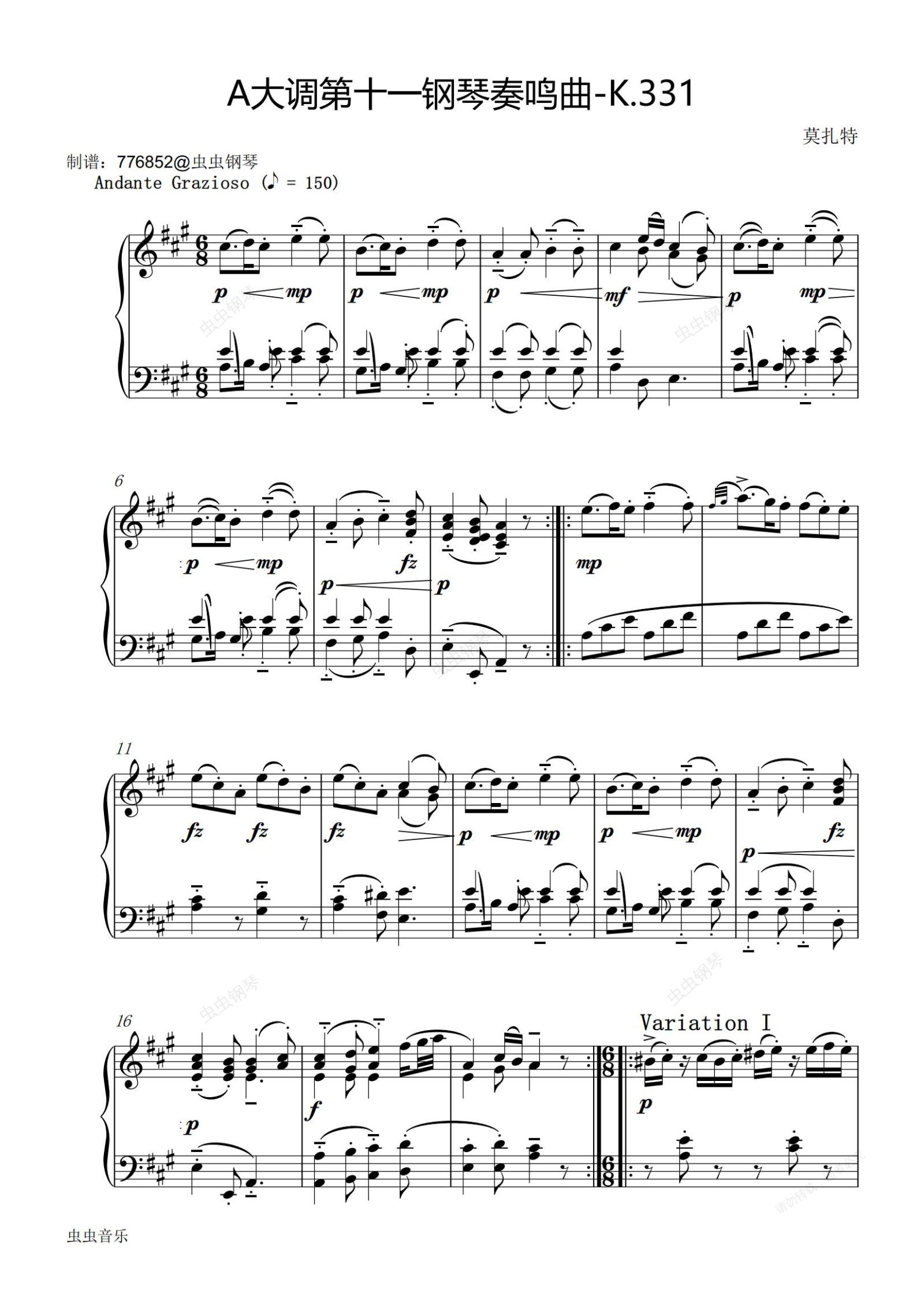 钢琴谱:A大调第十一钢琴奏鸣曲-K.331