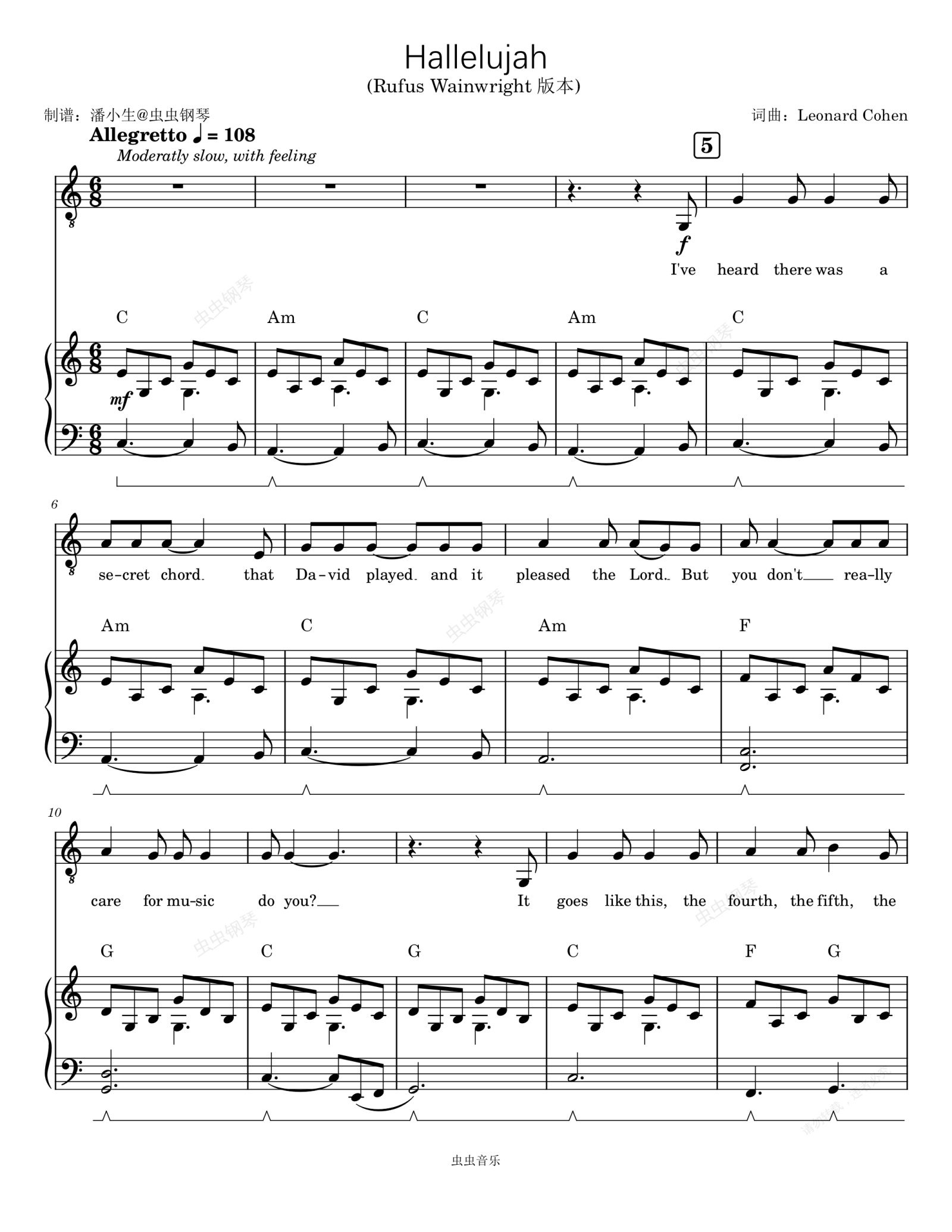 钢琴谱:Hallelujah,哈利路亚,原调带和弦标记人声,Rufus Wainwright版本,钢琴伴奏弹唱谱