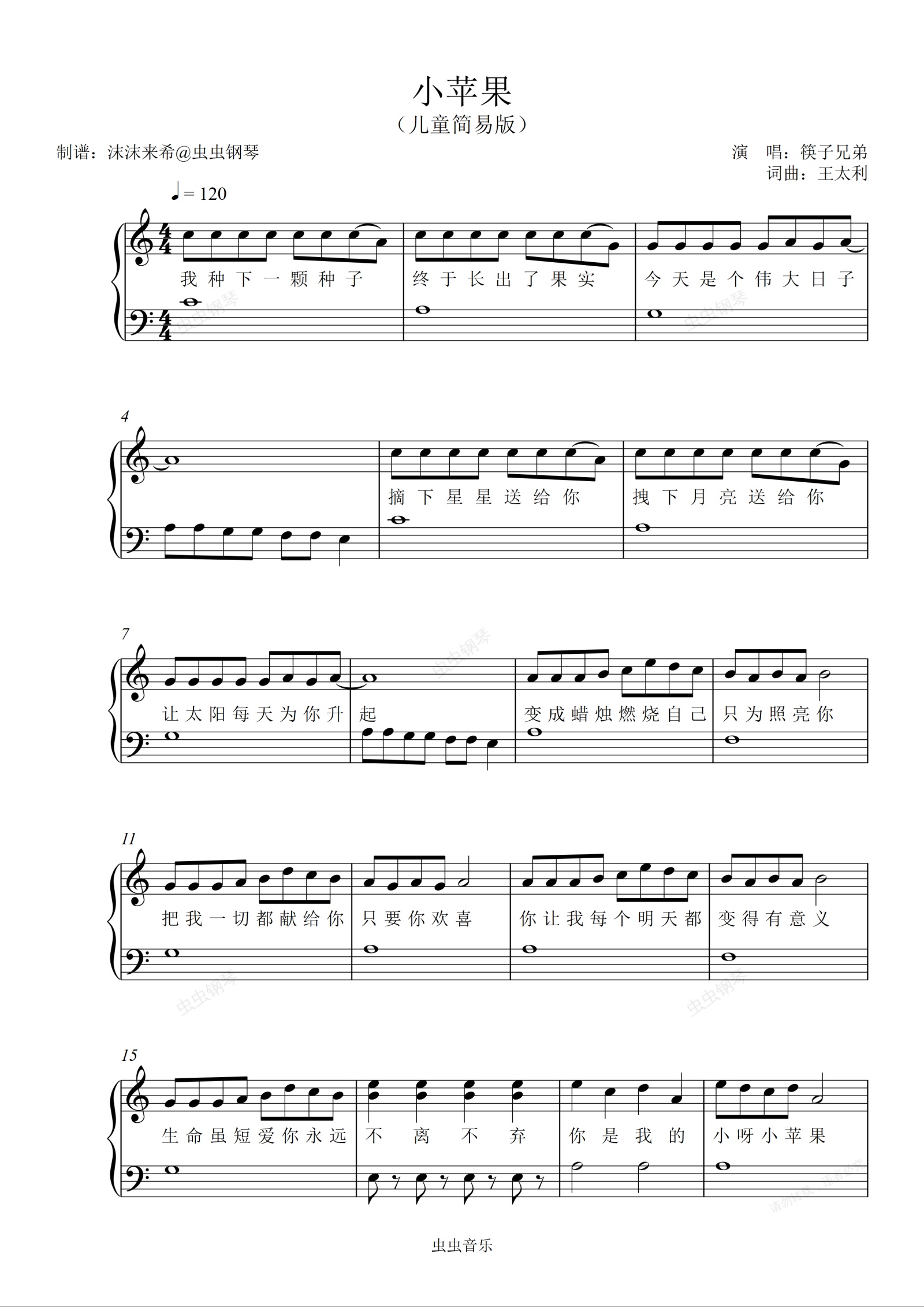 钢琴谱:《小苹果》儿童简易版 筷子兄弟