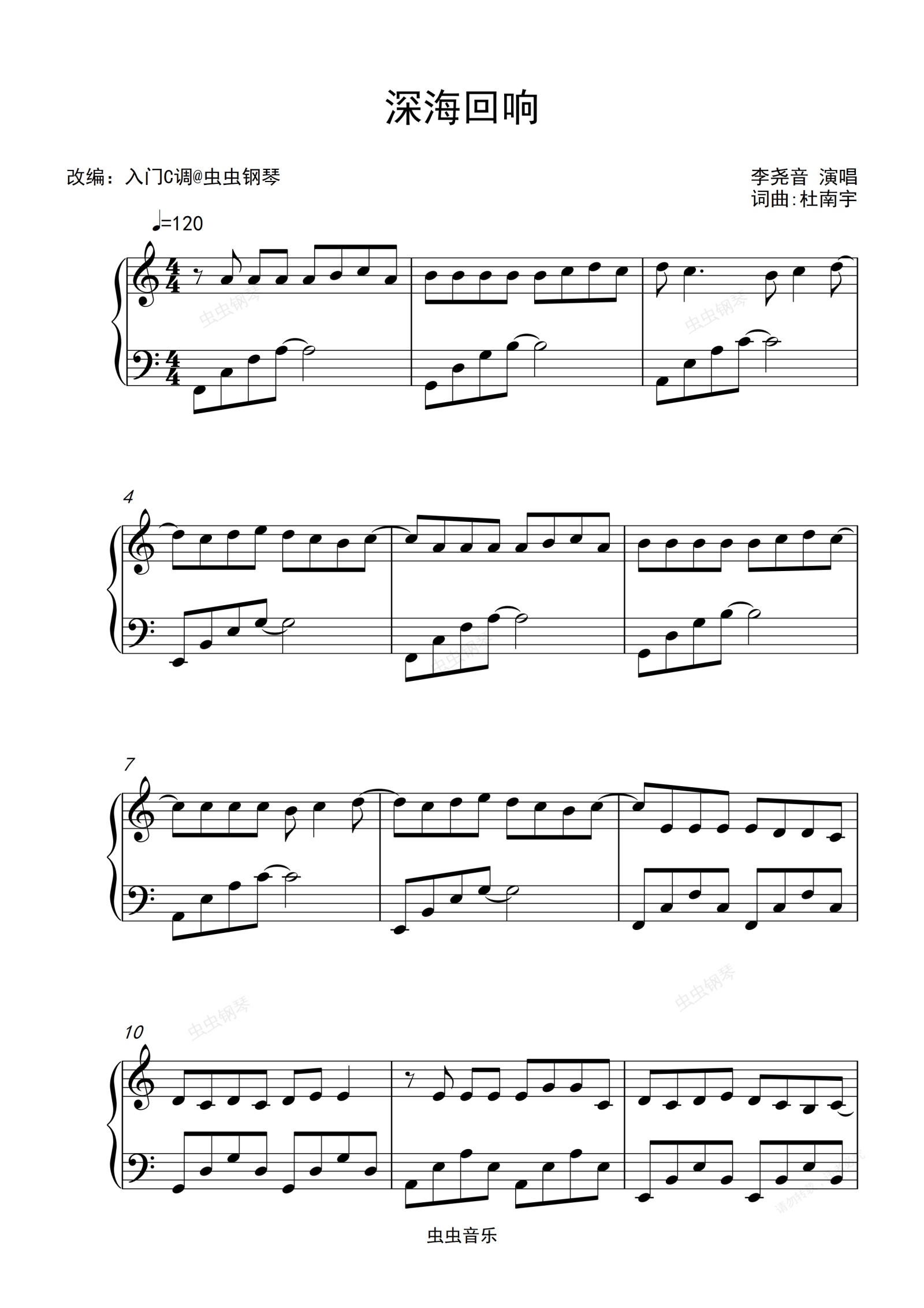 钢琴谱:李尧音《深海回响》入门C调简单版
