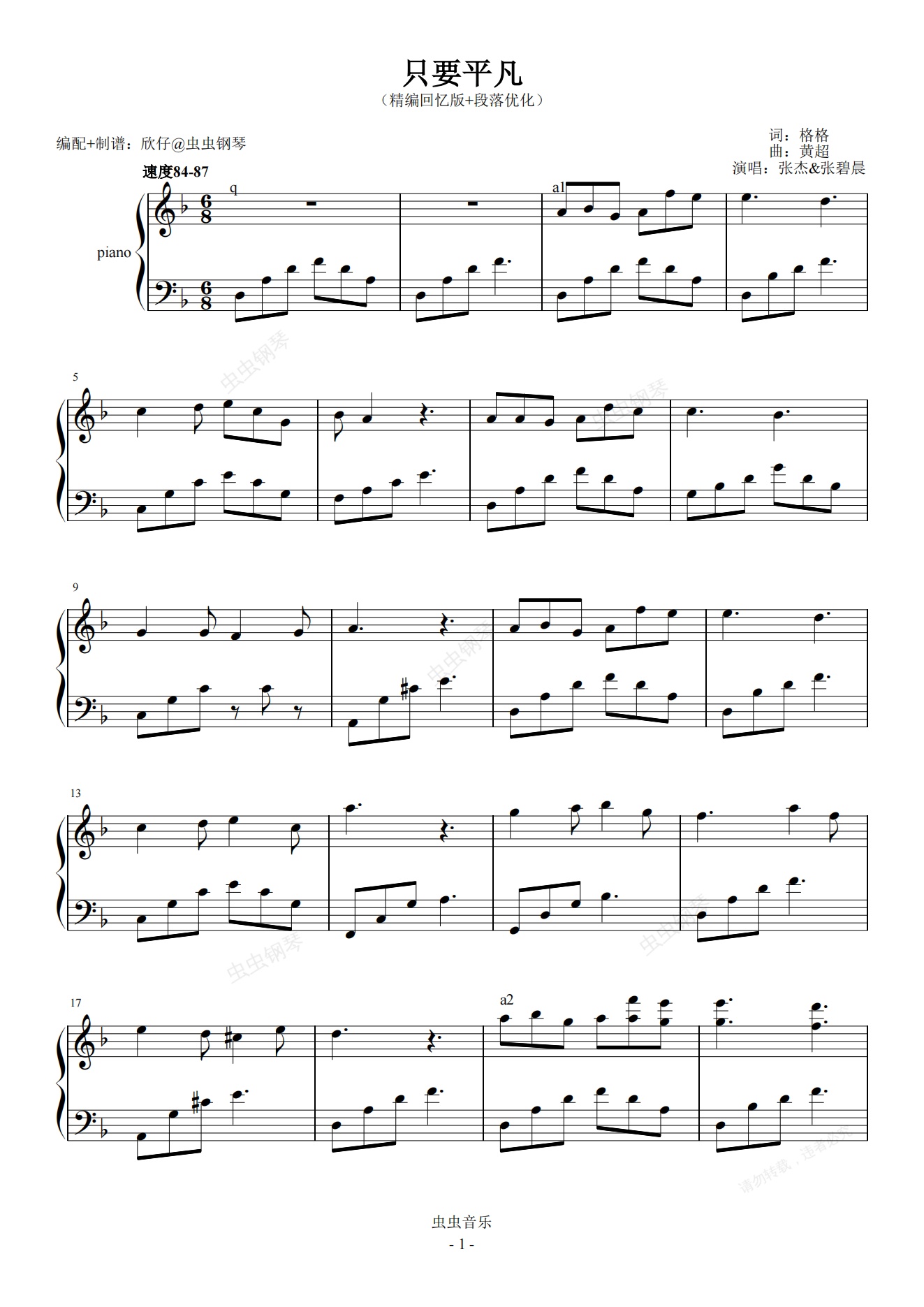 钢琴谱:张杰&张碧晨-d《只要平凡》(精编回忆版+段落优化)