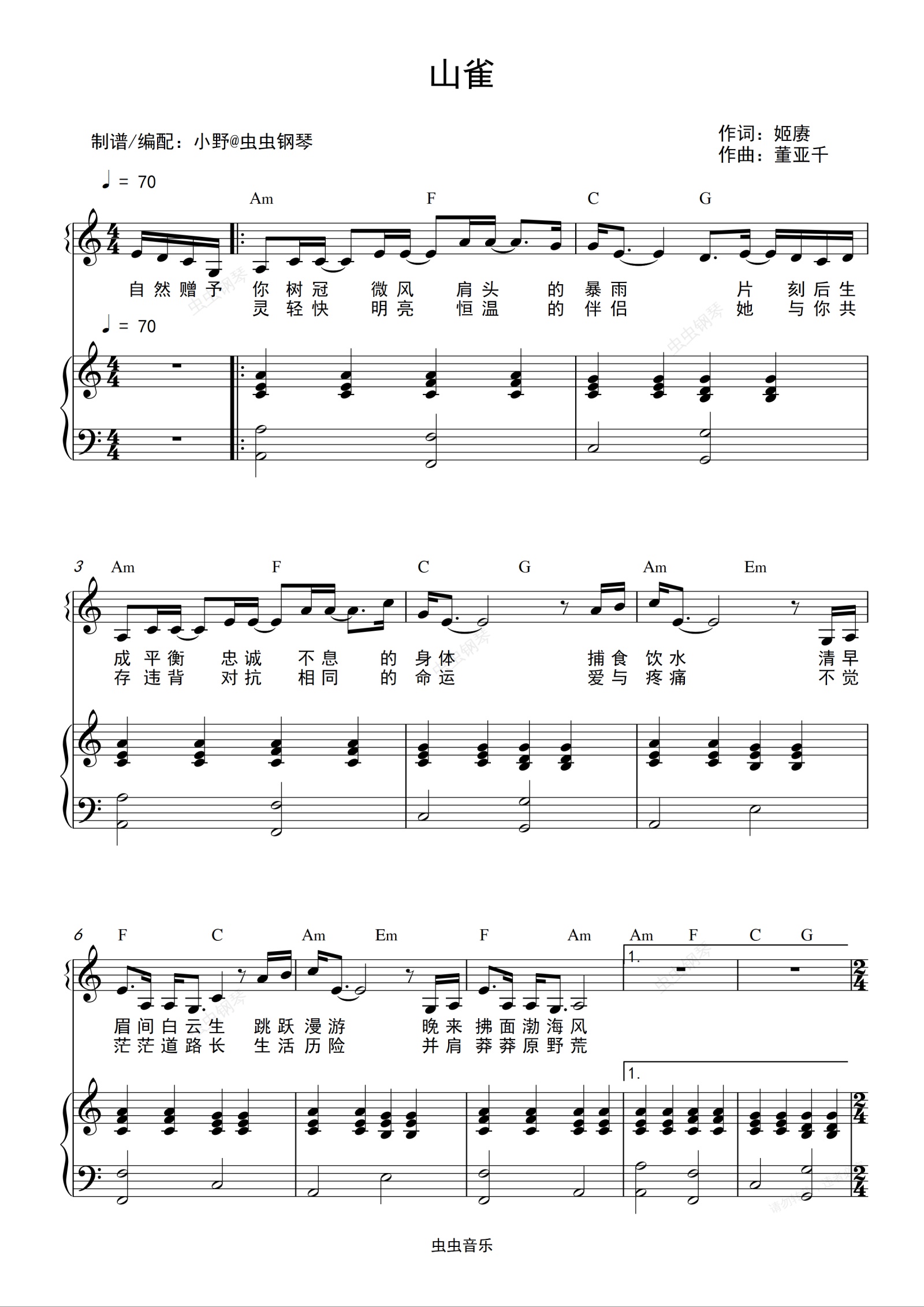 钢琴谱:山雀(和弦弹唱版)