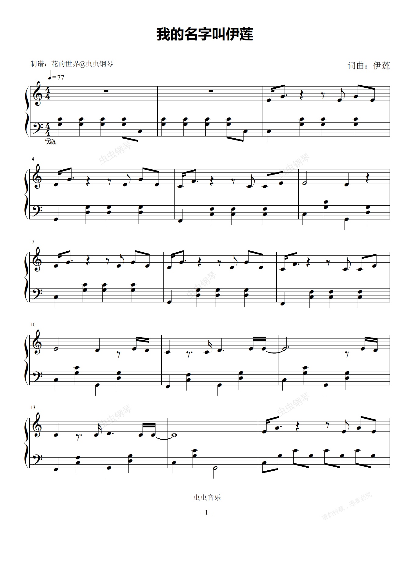 钢琴谱:我的名字叫伊莲 C调简易版 流行经典