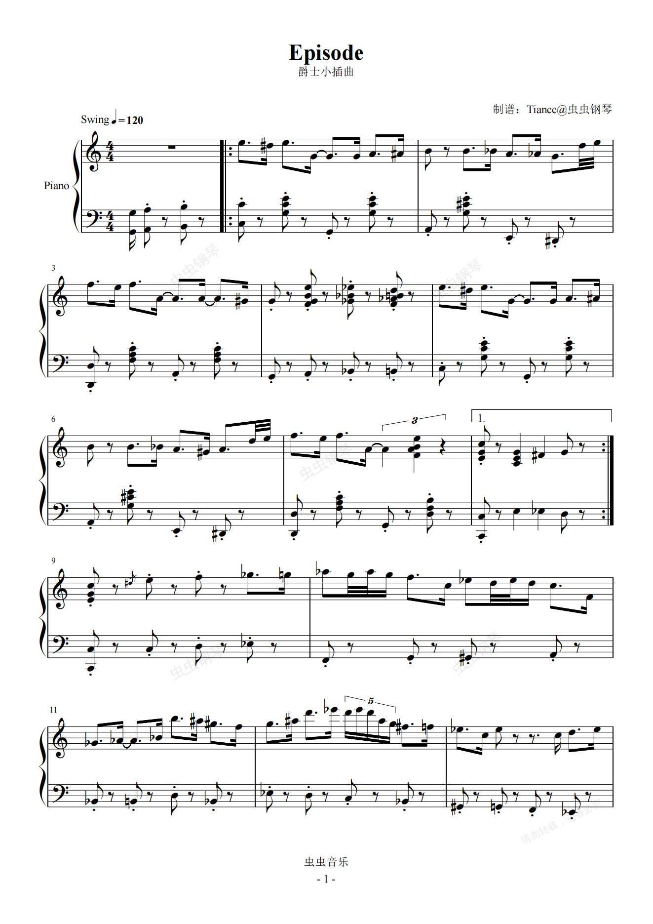 钢琴谱:《爵士小插曲(Episode)》经典逗比小曲,鸽子人呢?这么不见了?