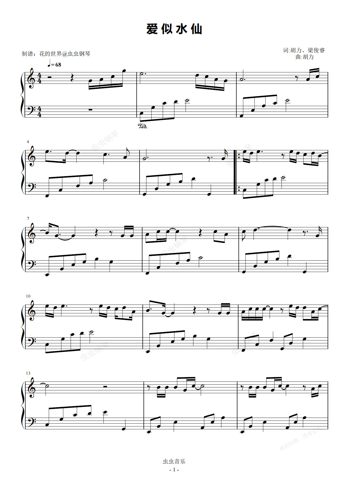 钢琴谱:爱似水仙 C调简易版 金海心