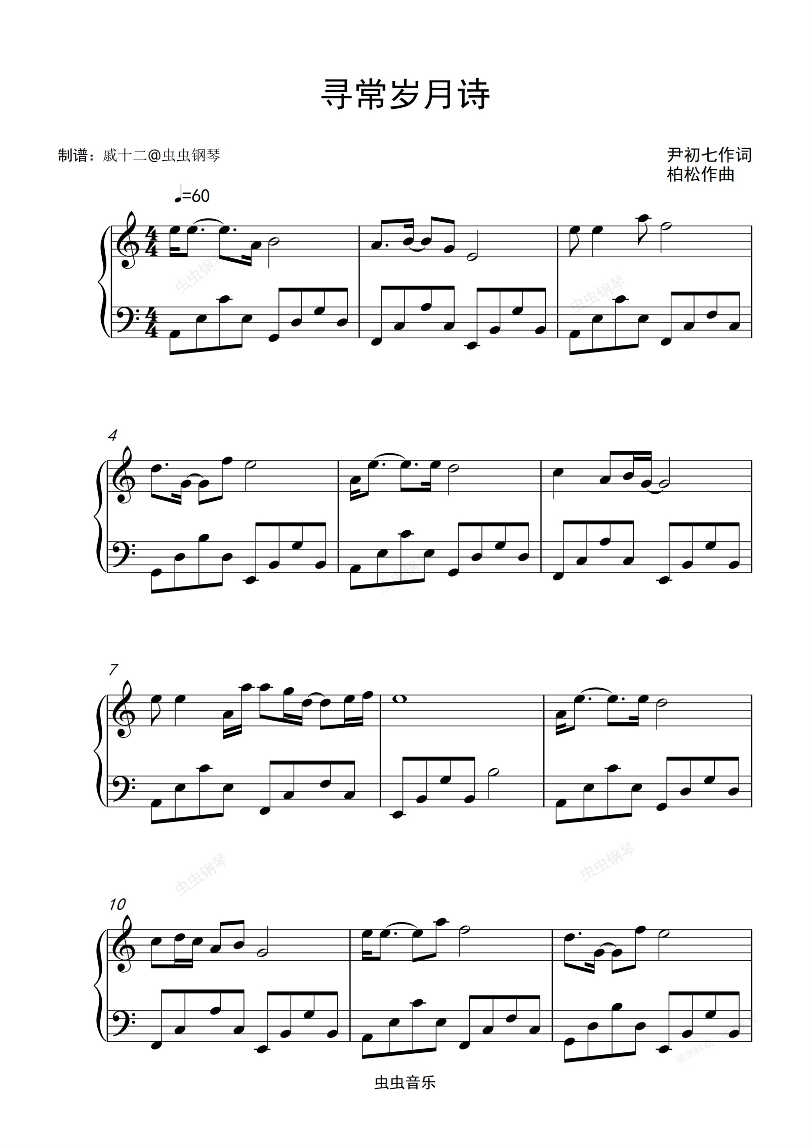 钢琴谱:寻常岁月诗-C调简单版
