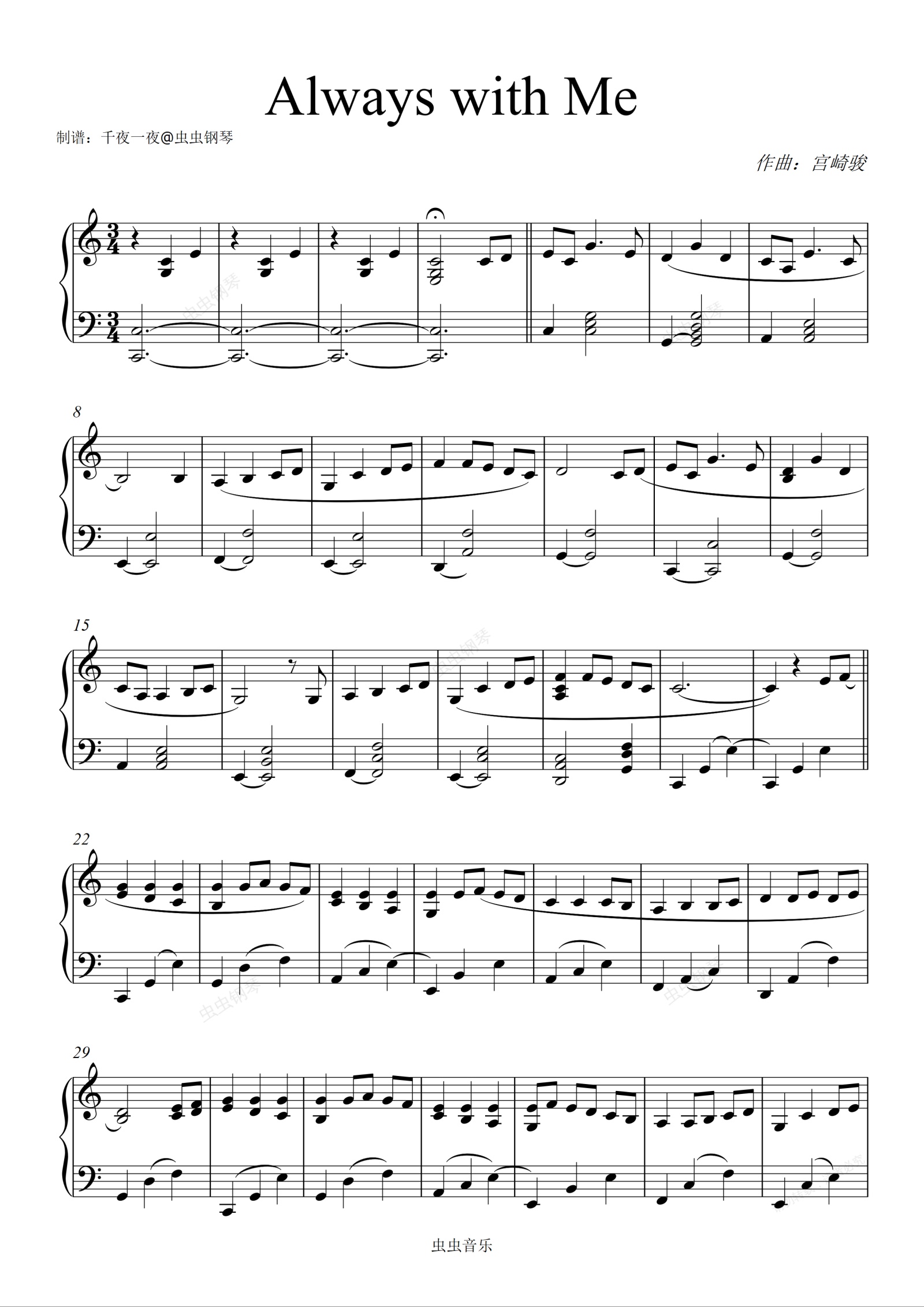 钢琴谱:千与千寻片尾曲《always with me》いつも何度でも(永远同在)C调版