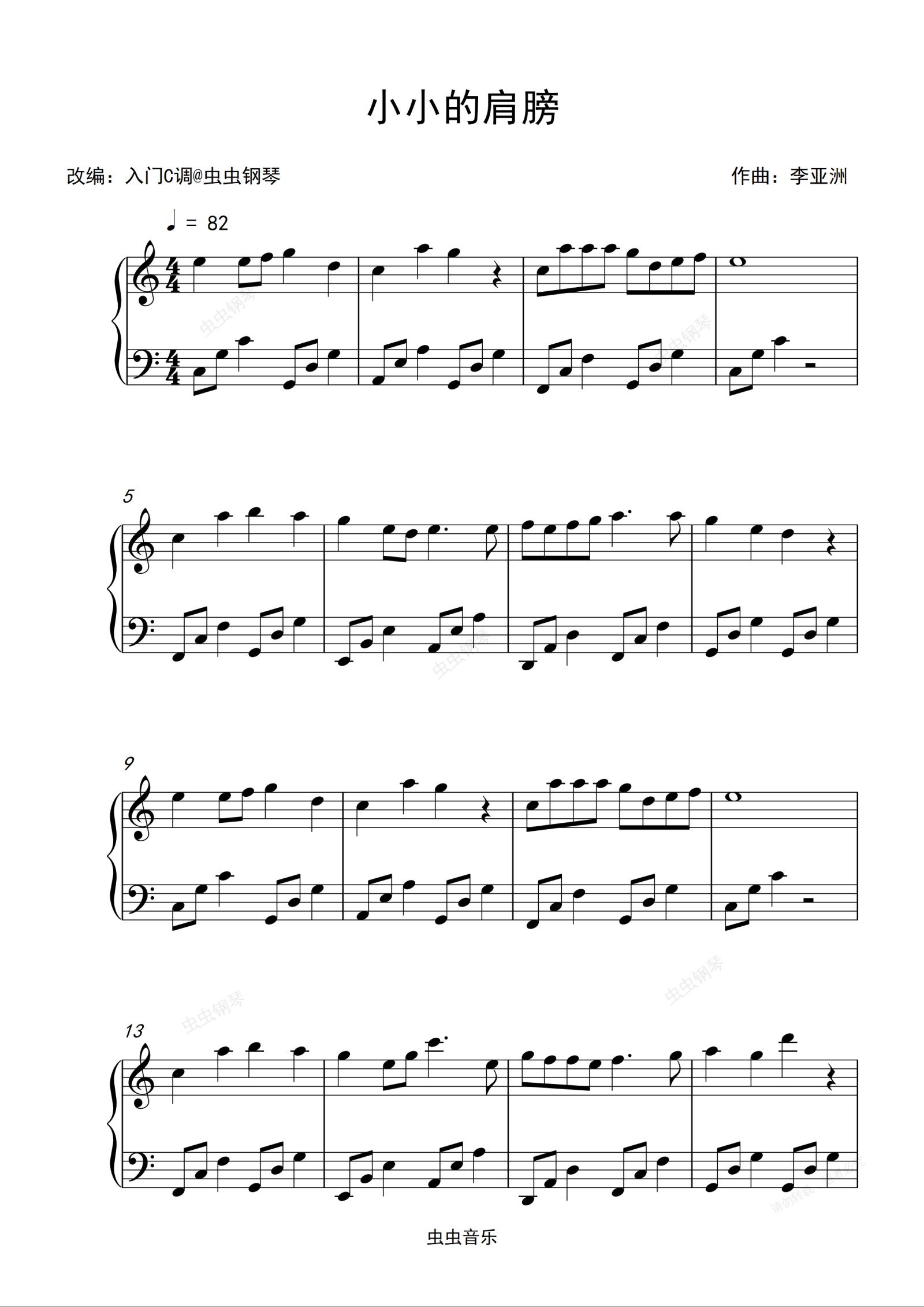 钢琴谱:龚俊《小小的肩膀》入门C调简单版