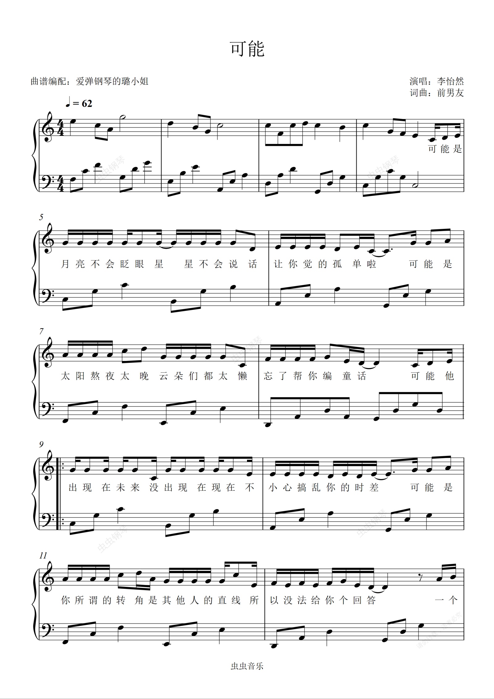 钢琴谱:可能 - 抖音热歌 - C调简单版(适合初学者) - 附歌词
